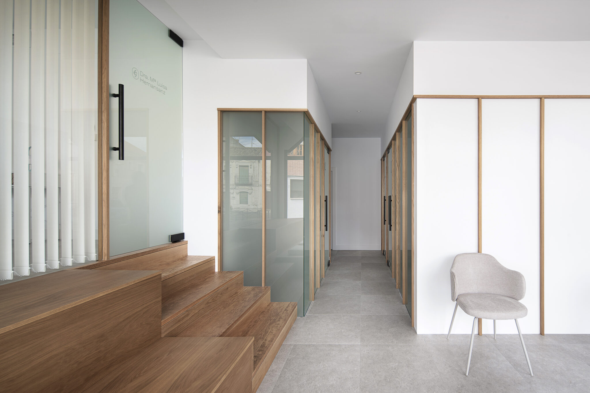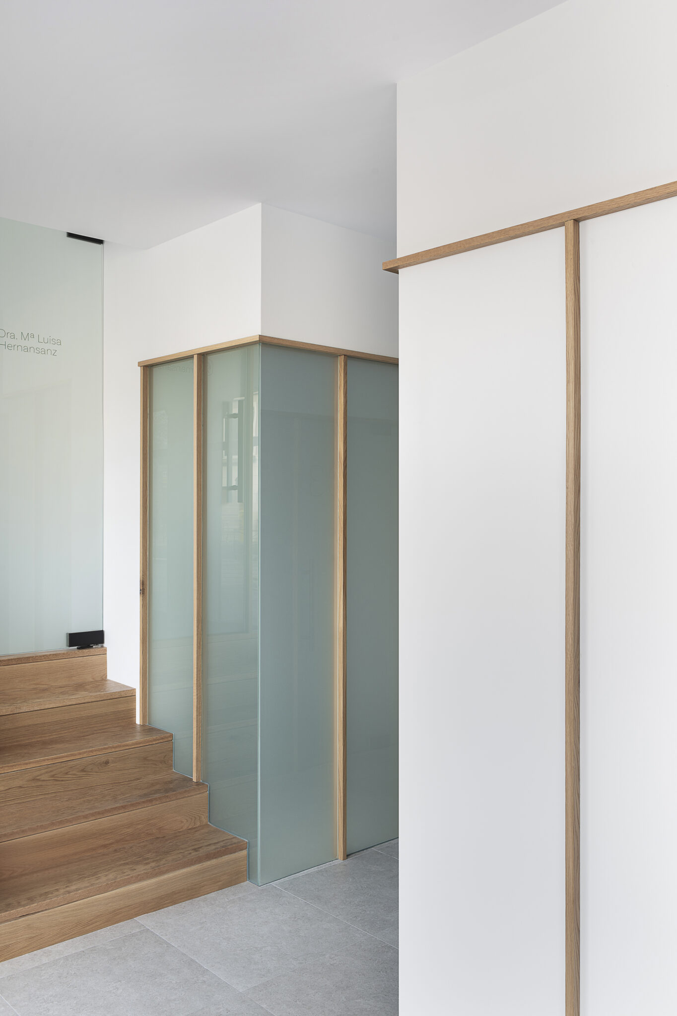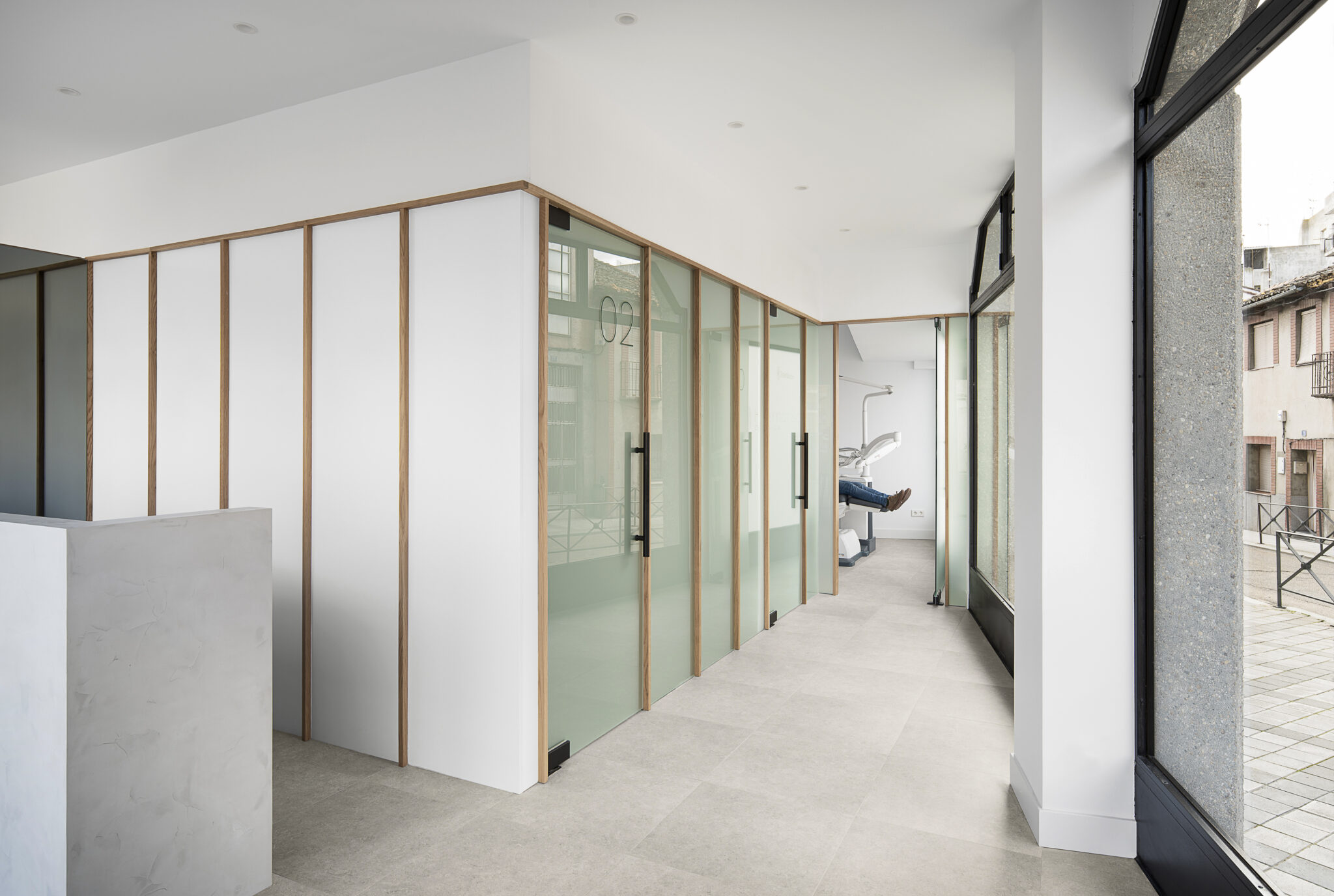 Desde el punto de vista de la distribución, la clínica se organiza a través de una secuencia de volúmenes que ordenan de manera clara todo el programa. Desde el distribuidor principal nacen dos cajas paralelas que albergan los gabinetes odontológicos y otras áreas de uso interno. Ambas piezas quedan separadas por un segundo distribuidor accesible desde la sala de espera, mejorando la circulación y la privacidad. La materialidad de estos volúmenes se resuelve mediante cristales traslúcidos modulados con listonado de roble, tanto en anchura como en altura, generando una imagen contemporánea, luminosa y coherente.