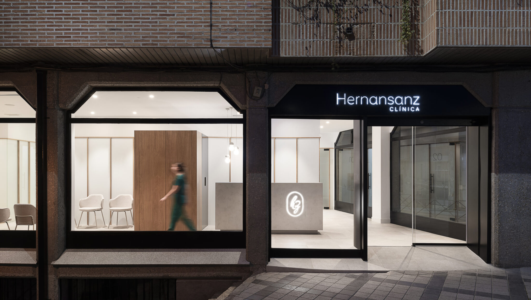 El diseño interior refleja nuestra forma de entender la arquitectura de clínicas dentales en Valladolid: espacios bien organizados, materiales de alta calidad y una imagen cuidada que transmite profesionalidad y confianza. En la zona de acceso, el mostrador principal de microcemento gris claro, realzado con una tira LED inferior, se convierte en uno de los elementos protagonistas. A ello se suma el logotipo de la clínica tallado en negativo y retroiluminado, reforzando la identidad visual del negocio desde el primer momento.