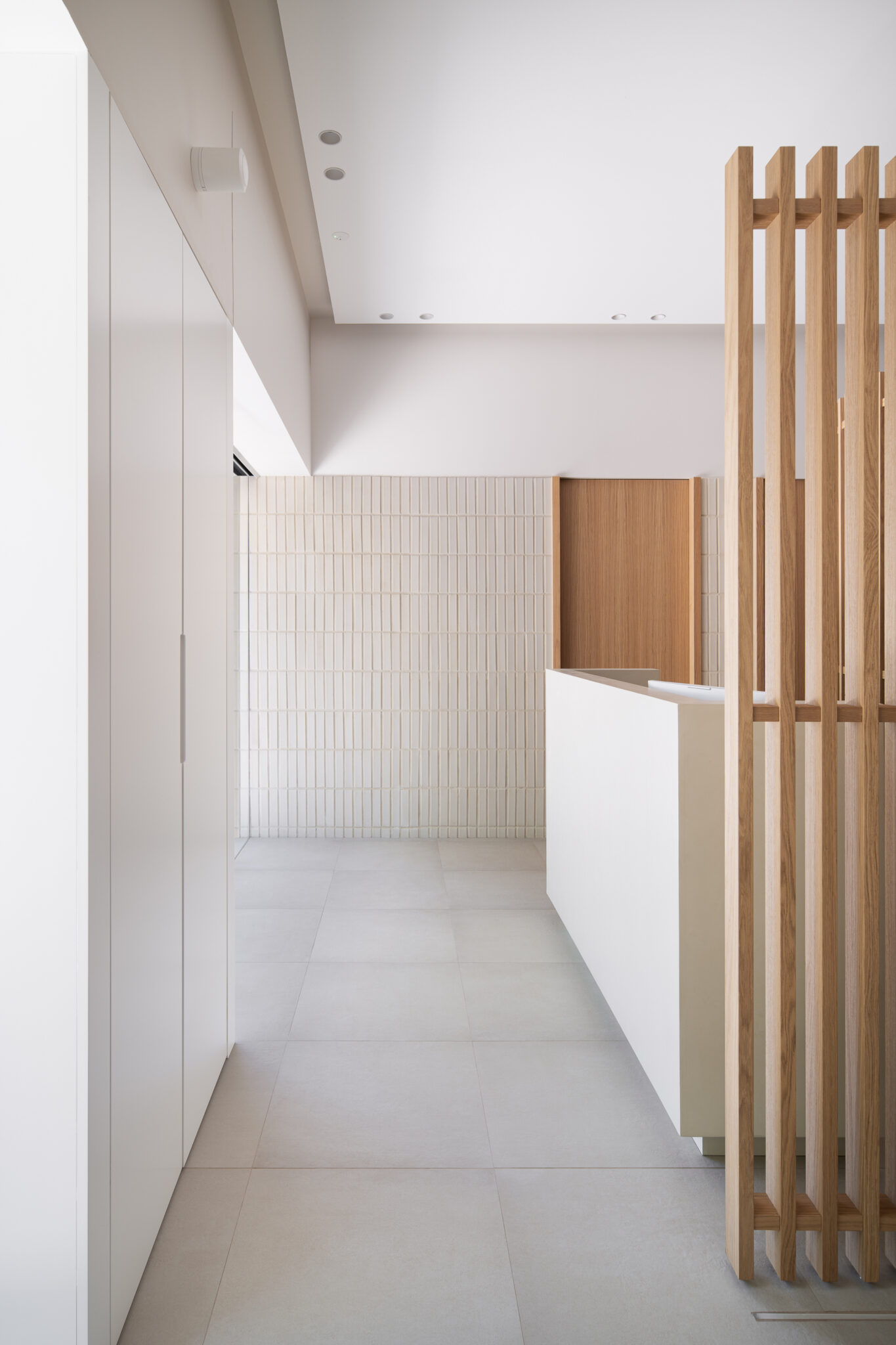 La sala de espera mantiene esta coherencia estética, apostando por un diseño limpio, luminoso y confortable que ayuda a reducir el estrés habitual asociado a la visita al dentista. Este enfoque centrado en el bienestar del paciente es uno de los pilares fundamentales del proyecto.