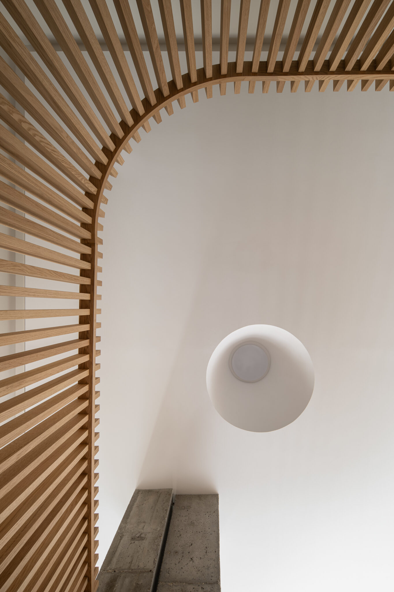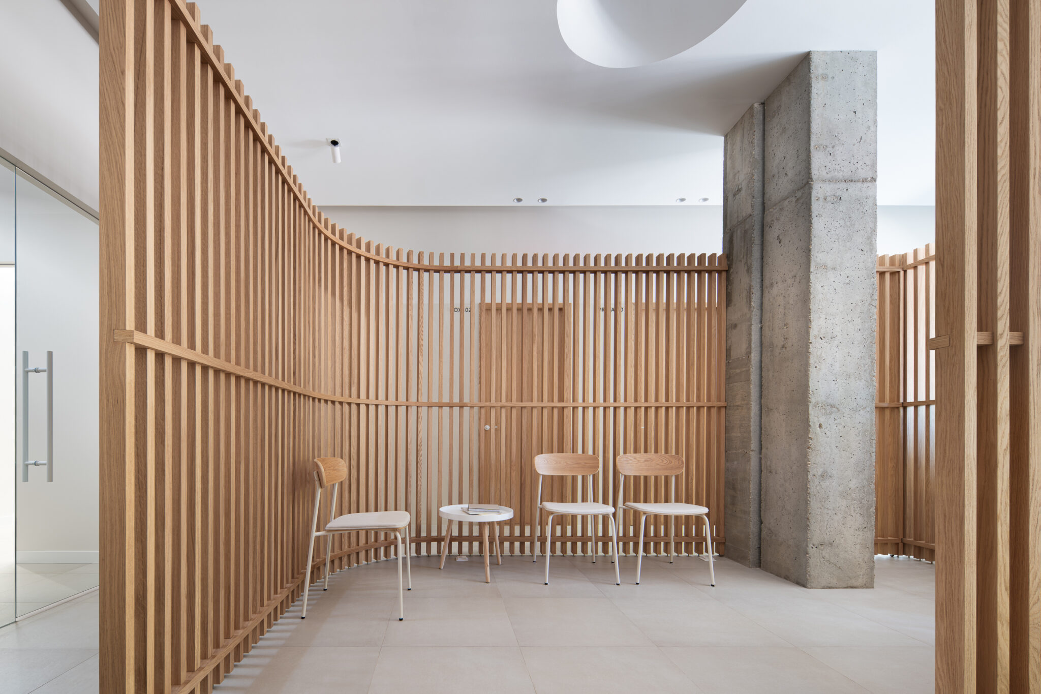 La estructura principal, formada por una celosía de madera chapada en roble, se convierte en el elemento protagonista del proyecto. Su presencia aporta identidad visual al conjunto, al mismo tiempo que cumple una función organizativa. Esta celosía, que se eleva hasta una altura estratégica, genera una línea continua que recorre el interior, creando una sensación de mayor amplitud y altura. Además, permite una adecuada distribución de la luz natural, favoreciendo la iluminación en las distintas estancias y generando un ambiente más cálido y acogedor, clave en espacios de odontología moderna.