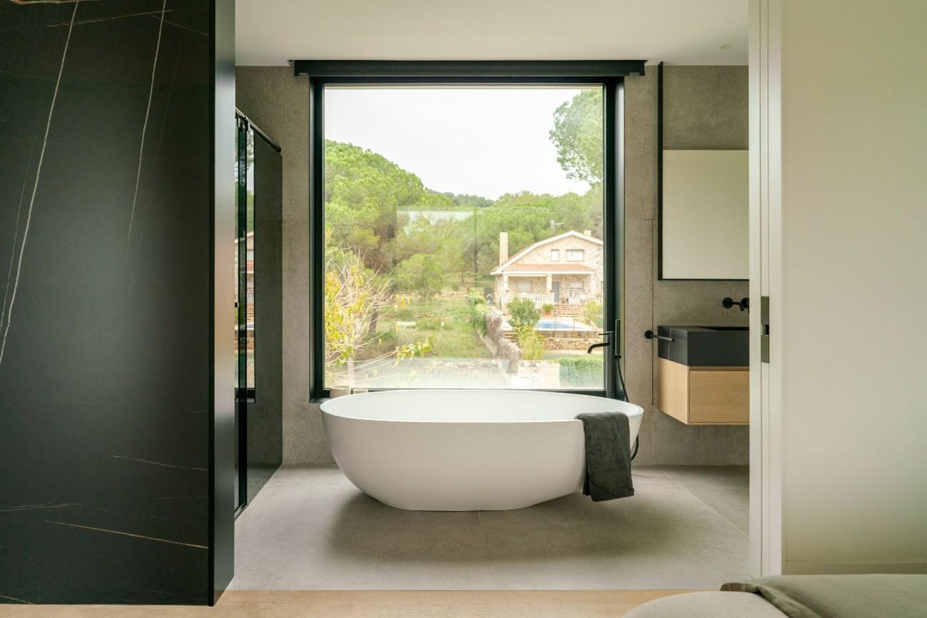 La suite principal, una de las piezas más representativas del proyecto, se articula a partir de un cabecero de roble, diseñado a medida por Coblonal, que integra un escritorio en su cara posterior y da paso a un vestidor sin separaciones. La conexión con la terraza es inmediata y la transición hacia el baño se resuelve con una puerta corredera de gran formato. Al abrirla, aparece el elemento protagonista: una bañera exenta bajo una gran ventana que enmarca el paisaje.