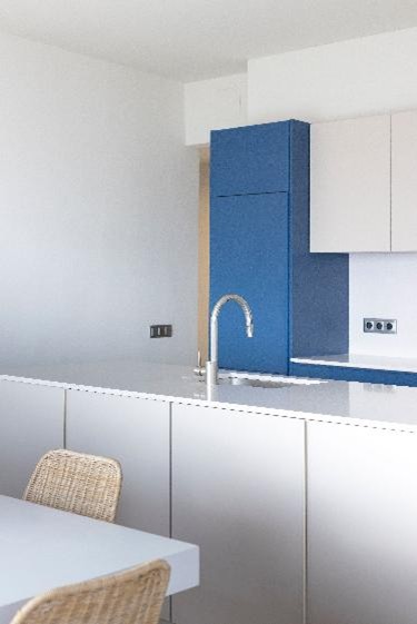 La cocina queda abierta al comedor, de tal modo que la brisa marina y la luz natural llega a todos sus rincones. Borrós ha optado por la belleza de las formas simples, con mobiliario diseñado a medida -sin tiradores-, donde la pureza del blanco se combina con módulos realizados en un potente azul Klein.