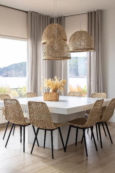 El comedor se convierte en un espacio contemplativo gracias a sus grandes ventanales abiertos al mar. Aquí, como en el resto de la vivienda, dominan las texturas naturales: cortinas de lino, lámparas colgantes y sillas de ratán aportan calidez y contraste al blanco impoluto de las paredes y a la gran mesa de comedor cuadrada, lacada en blanco.