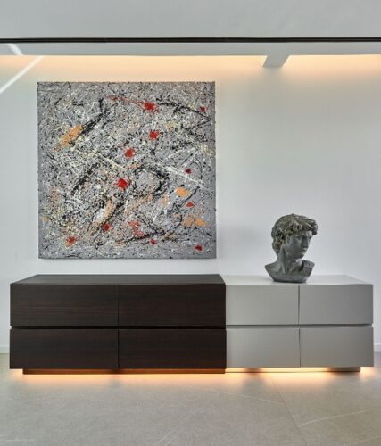 En la planta superior, los dormitorios mantienen el equilibrio sobrio y elegante del resto de la vivienda. El dormitorio principal combina madera oscura y blanco en una paleta cromática serena. Un amplio pasillo con armarios enfrentados —diseñados sin tiradores para lograr continuidad visual— conduce al espacio principal, presidido por una obra de arte abstracta y un aparador bicolor coronado por un busto clásico.