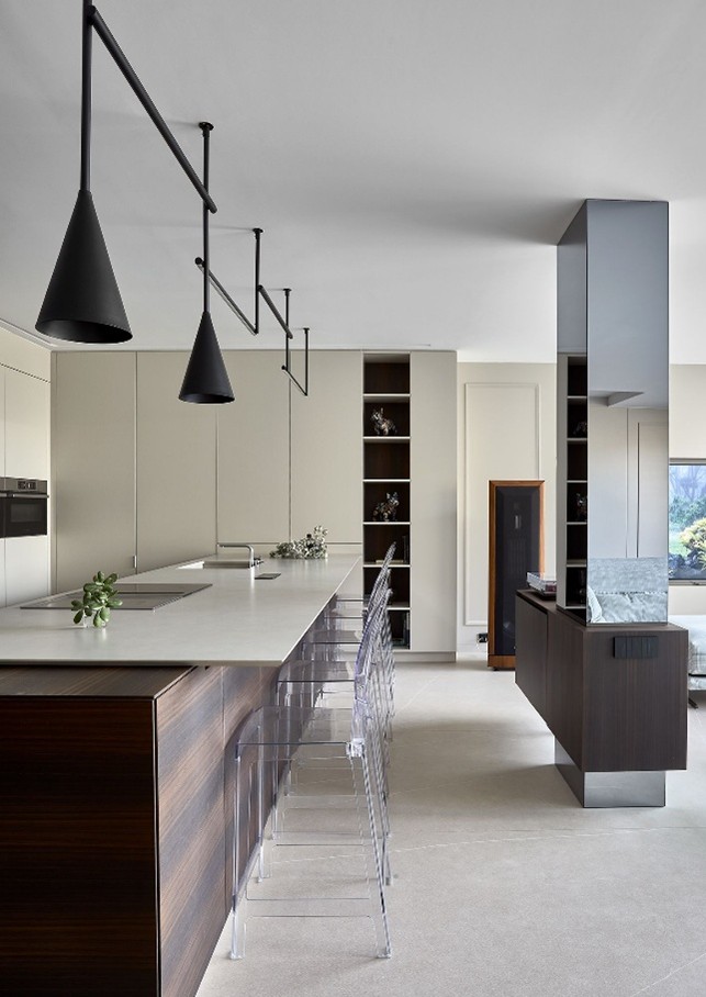 La cocina abierta con isla se integra de manera armoniosa en la zona de día, con frentes en madera oscura que se equilibran con otros en blanco. Además de delimitar visualmente el espacio, la gran isla de cocina incluye una zona con sillas para desayunos o meriendas y ofrece espacio de almacenamiento adicional.