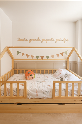 Este dormitorio está diseñado para el momento en que el niño deja la cuna y comienza a dormir en una cama baja. La cama en forma de casita, cercana al suelo, permite que el niño suba y baje de forma independiente, fomentando su autonomía y libertad de movimiento, principios esenciales del método Montessori. Esta solución reduce significativamente el riesgo de caídas, garantizando un entorno seguro y acogedor para el descanso y el juego.