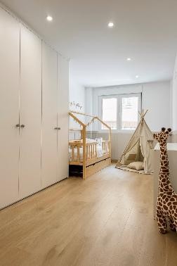 El mobiliario a medida de Tegar, que incluye un armario de puertas lisas de suelo a techo, aprovecha al máximo el espacio de almacenamiento sin romper la pureza visual del ambiente. La iluminación cálida y el predominio del blanco potencian la luminosidad natural, mientras que el suelo de madera clara aporta continuidad y calidez al conjunto. Un rincón de juego, con una tienda tipi y cojines, invita a la imaginación y al juego libre, haciendo de este dormitorio un espacio versátil que crece con el niño, sin renunciar al estilo ni a la practicidad.