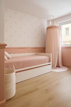 La pared, con molduras a media altura y papel pintado con delicadas flores refuerza la calidez sin sobrecargar el ambiente. Se ha apostado por un diseño que apoya el desarrollo infantil, equilibrando estética, funcionalidad y emoción.