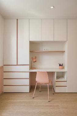 El segundo dormitorio, ideal para acompañar las necesidades de la etapa de la preadolescencia, es un espacio que inspira dulzura y orden. La paleta cromática apuesta tonos empolvados que se combinan con el blanco para crear una atmósfera serena y envolvente.