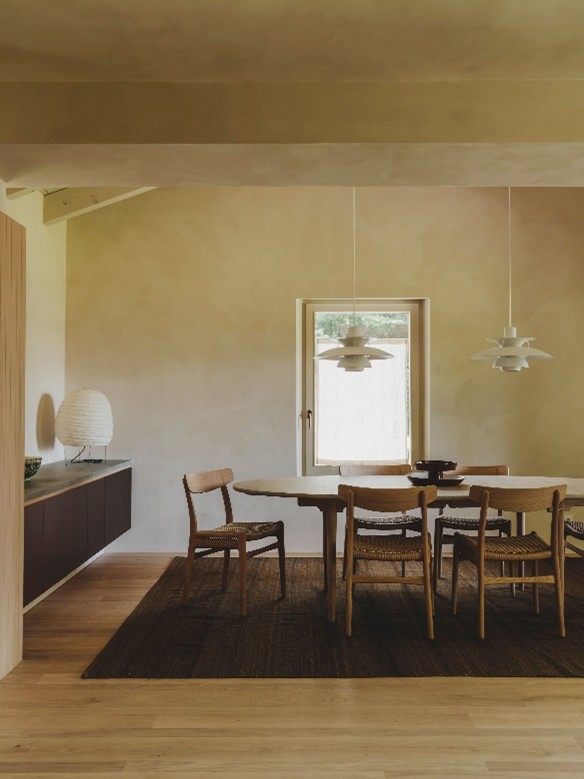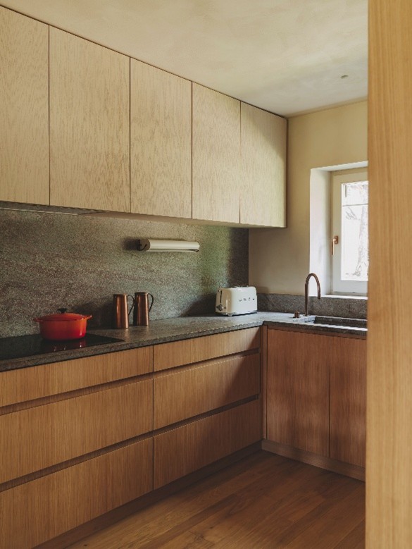 Para completar esta transición hacia un ambiente más luminoso, fresco y acogedor, la paleta de materiales combina texturas refinadas y nobles. El pavimento se resuelve con un parquet de roble en tarima con lamas de distintos anchos, que aporta dinamismo y naturalidad. Las paredes adquieren una textura sutil gracias al polvo de mármol, mientras que los techos de madera oscura se pintaron en tonalidades claras para potenciar la luz. En cocina, baños y sobre la chimenea se emplearon superficies de granito en dos tonalidades, generando contraste y solidez. Finalmente, los detalles de chapa de cobre en estantes y frentes de armarios introducen destellos cálidos y un carácter artesanal.