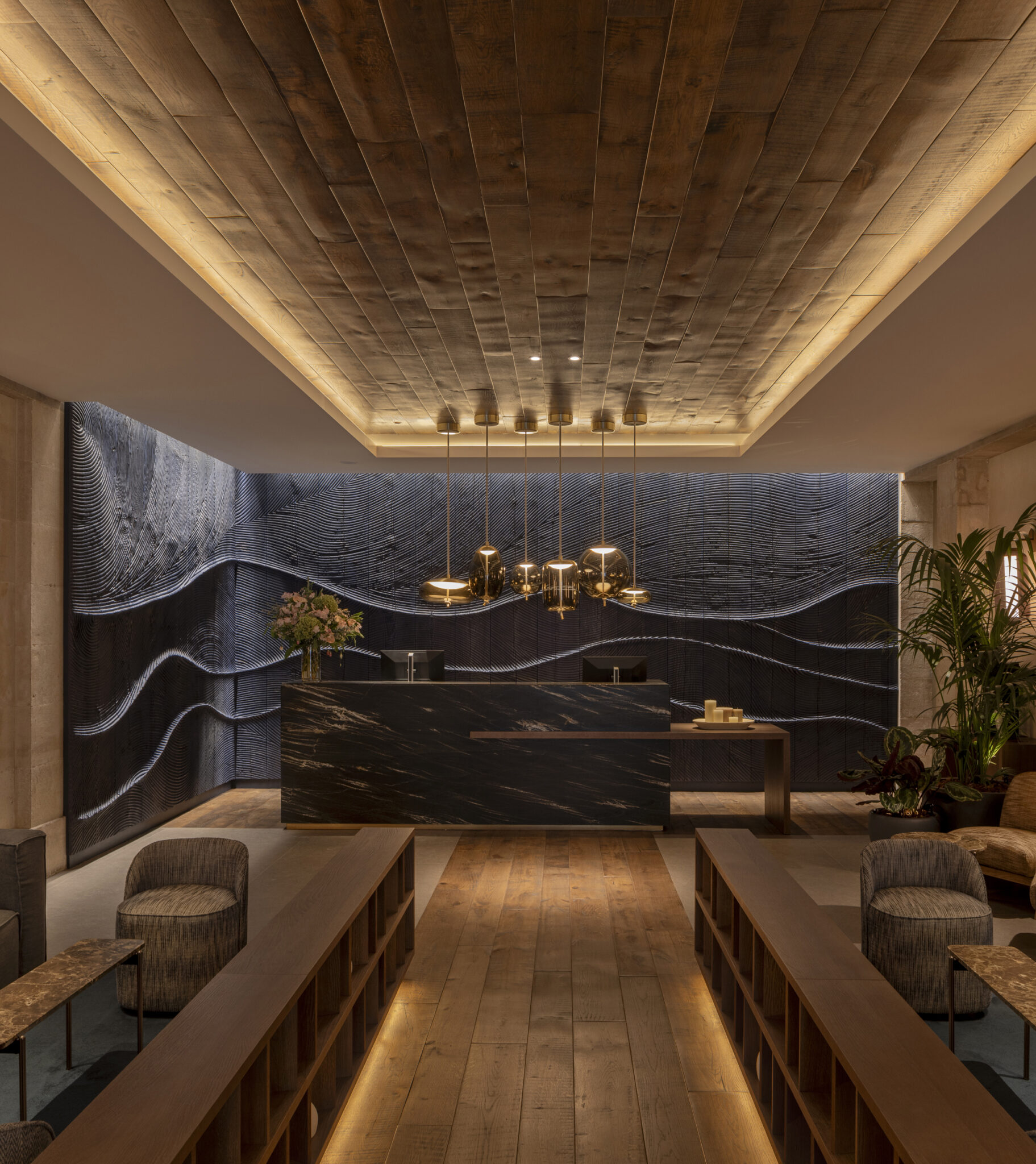 Desde esta idea, los espacios se trabajan desde la sensibilidad. El recorrido de acceso, desde la entrada hasta el mostrador de recepción, se concibe como una pasarela de barco al llegar a puerto. Tras la recepción, una gran escultura de madera del escultor Etienne Moyat, quemada y trabajada en relieve, evoca el movimiento de las olas en un azul intenso y profundo.