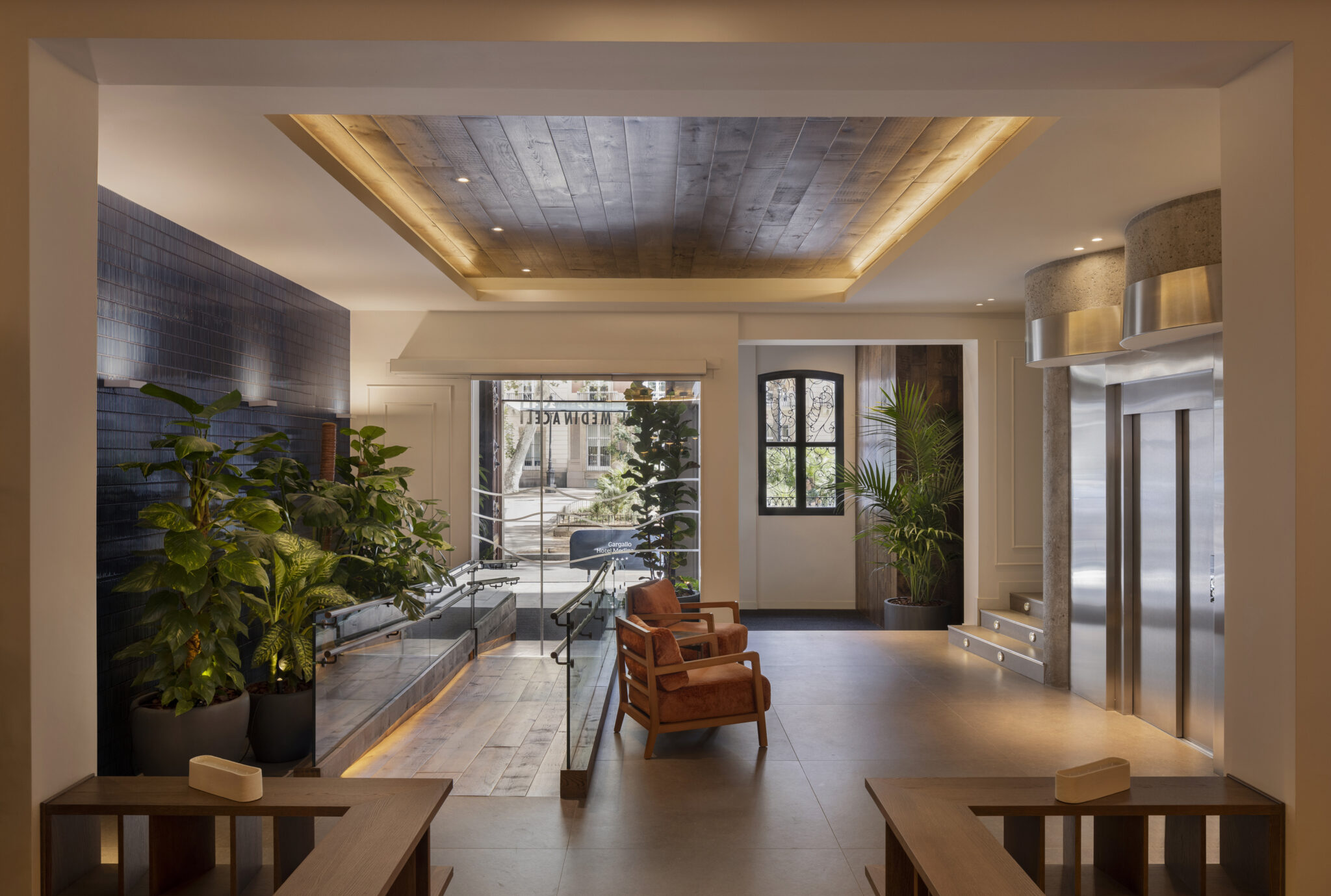 Dyd Interiorismo firma el proyecto de interiorismo para la reforma integral del Hotel Medinaceli, una intervención que abarca la totalidad del establecimiento: sus 84 habitaciones, las zonas comunes, la recepción, el lobby, el espacio de desayunos, la biblioteca, el patio central, la coctelería y la terraza situada en la planta superior.