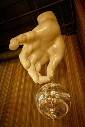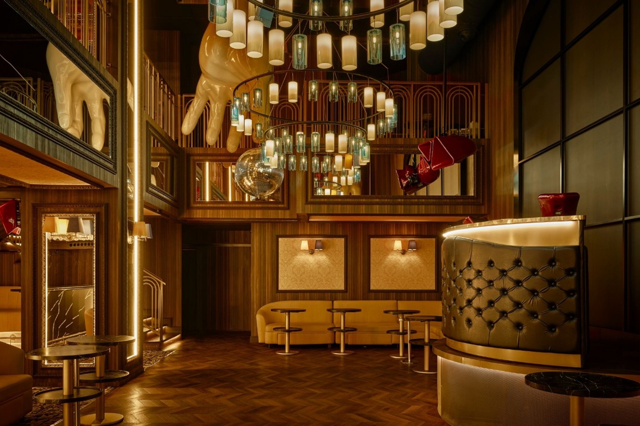 El juego de elementos fuera de escala aporta teatralidad al interior: las enormes manos que sostienen las bolas de discoteca y las lámparas diseñadas a medida visten el techo de la zona de baile, mientras que una serie de obras de arte retroiluminadas, desarrolladas ad hoc para el proyecto, dominan los espacios más estratégicos y refuerzan la narrativa visual del club.
