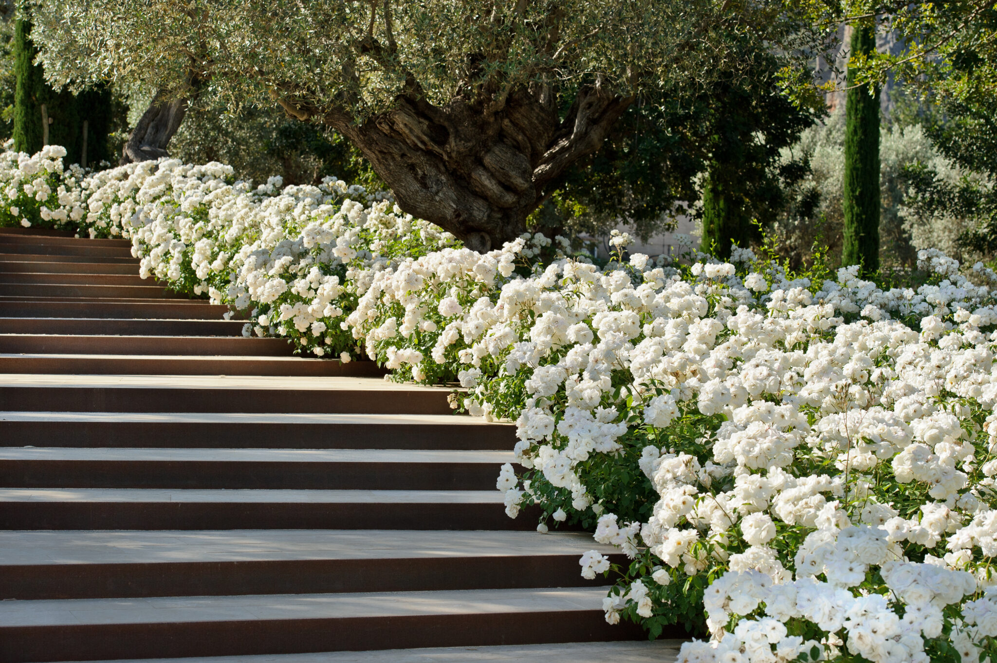 La escalera central, auténtica espina dorsal del proyecto, se enmarca con rosales iceberg blancos que aportan luminosidad y delicadeza. Cipreses y olivos introducen verticalidad y contraste cromático.