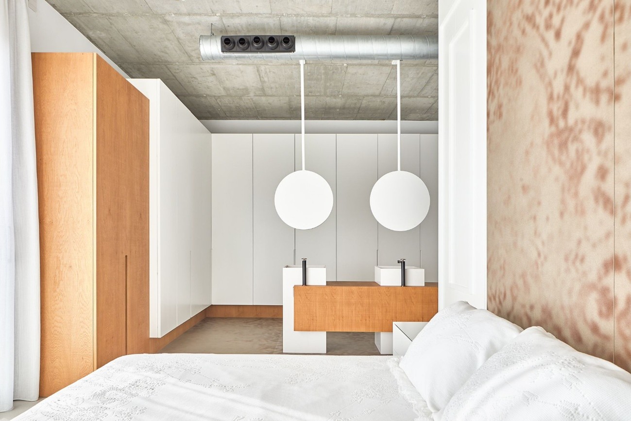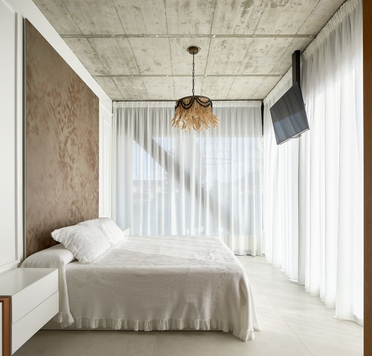 En la zona de noche, ubicada en la planta superior, la pieza central es un dormitorio principal tipo suite, concebido como un espacio privado de relajación para sus propietarios. Se trata de un espacio diáfano que apuesta por la continuidad visual, con cortinas de suelo a techo que tamizan la luz procedente de los grandes ventanales. El techo de hormigón visto deja a la vista los conductos, reforzando el carácter industrial y brutalista.