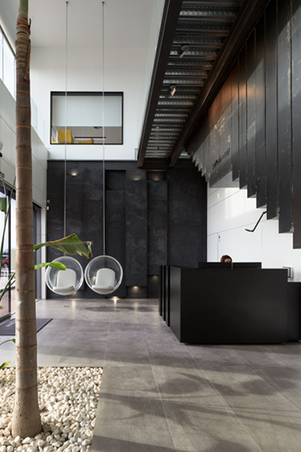 El acero y el cristal protagonizan el lenguaje arquitectónico, con soluciones diseñadas a medida donde la funcionalidad no interfiere en el recorrido de la luz, como las barandillas de cristal sin perfiles. En los pasillos, los conductos a la vista y las puertas en acero negro hablan del origen del espacio, enclavado en un área industrial.