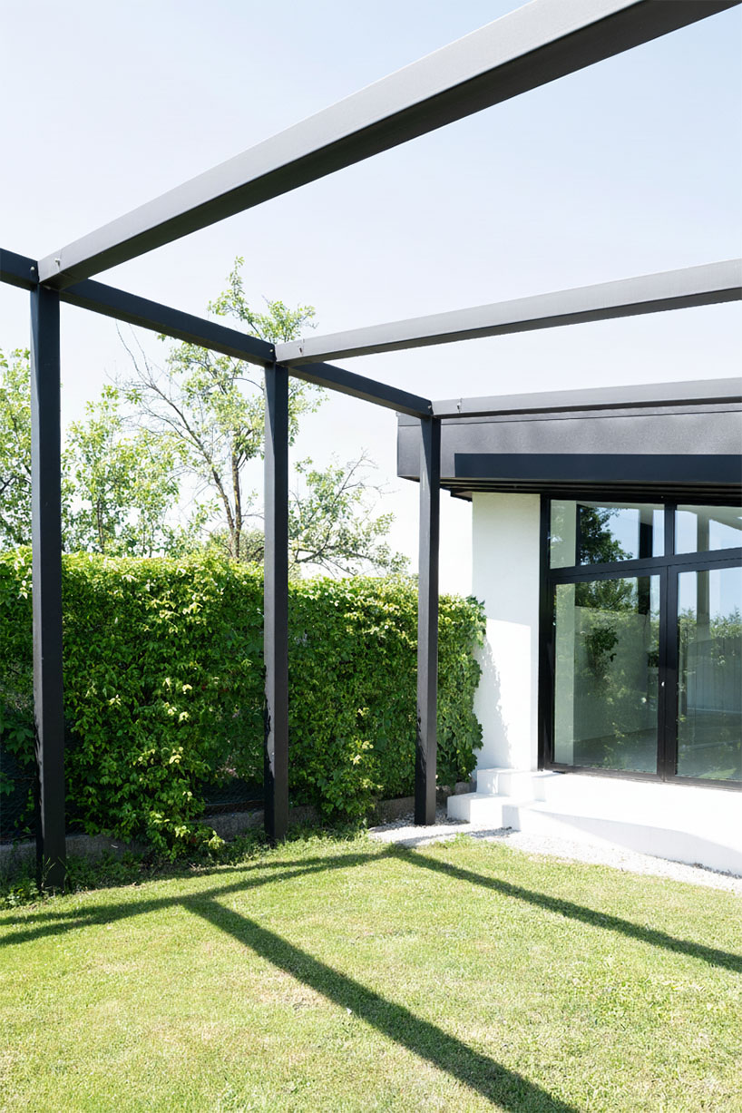 Mientras que la sección norte del edificio, correspondiente a los garajes, está completamente revestida por la piel mineral de chapa metálica con juntas verticales que envuelve toda la estructura, a medida que se avanza hacia el sur, este revestimiento se abre hasta desaparecer por completo en la pérgola de perfil rectangular, que representa a la perfección su estructura y esqueleto portante.