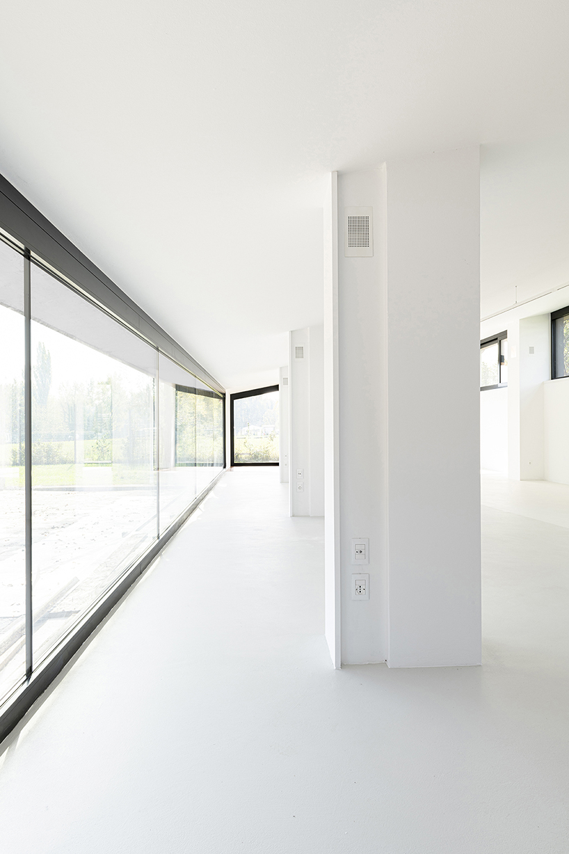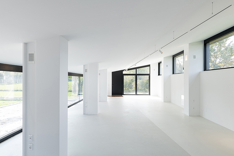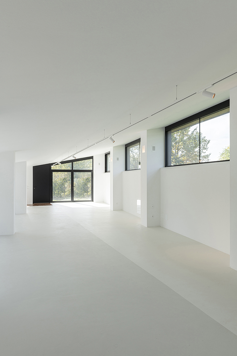 Esta narrativa de diseño se entrelaza finalmente con un principio de sustracción compositiva, que establece la interpenetración entre el cuerpo principal de la construcción y un volumen vertical paralelepípedo orientado según los ejes cardinales este-oeste. El resultado de esta interpenetración booleana define su programa espacial interno. Esta interpenetración espacial se convierte así en una oportunidad para delimitar la gran abertura luminosa horizontal hacia el norte, un recuerdo de la sucesión continua de arcos típica de las barchesse venecianas.