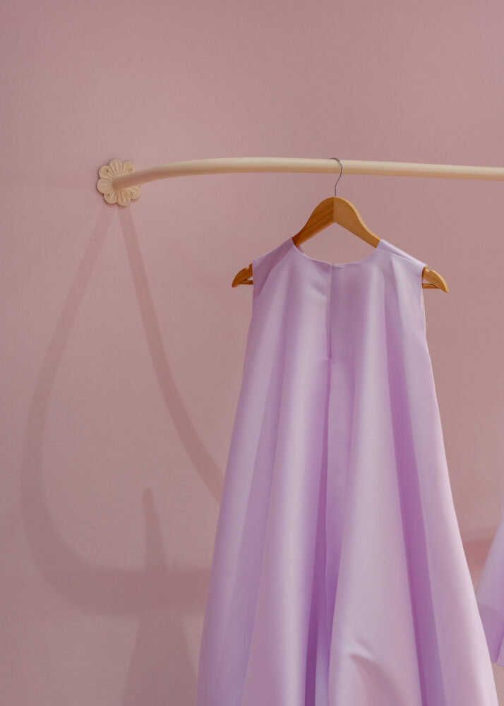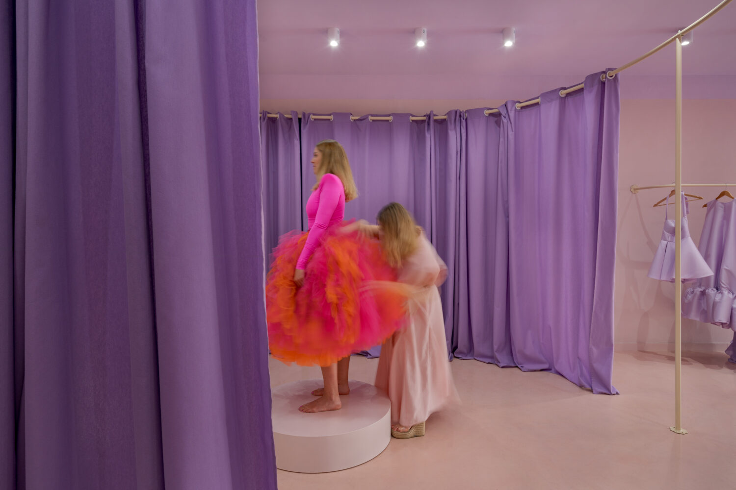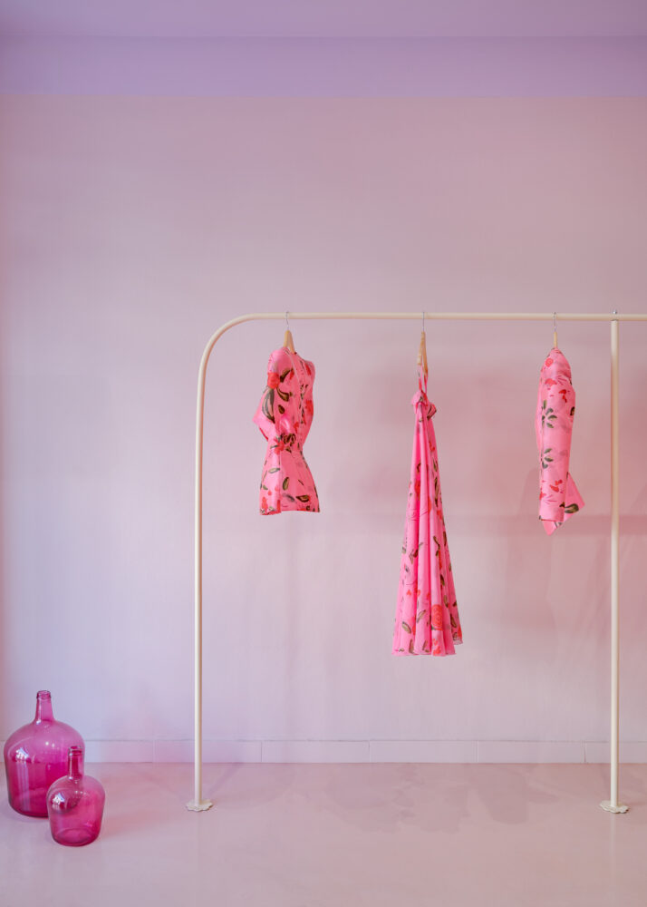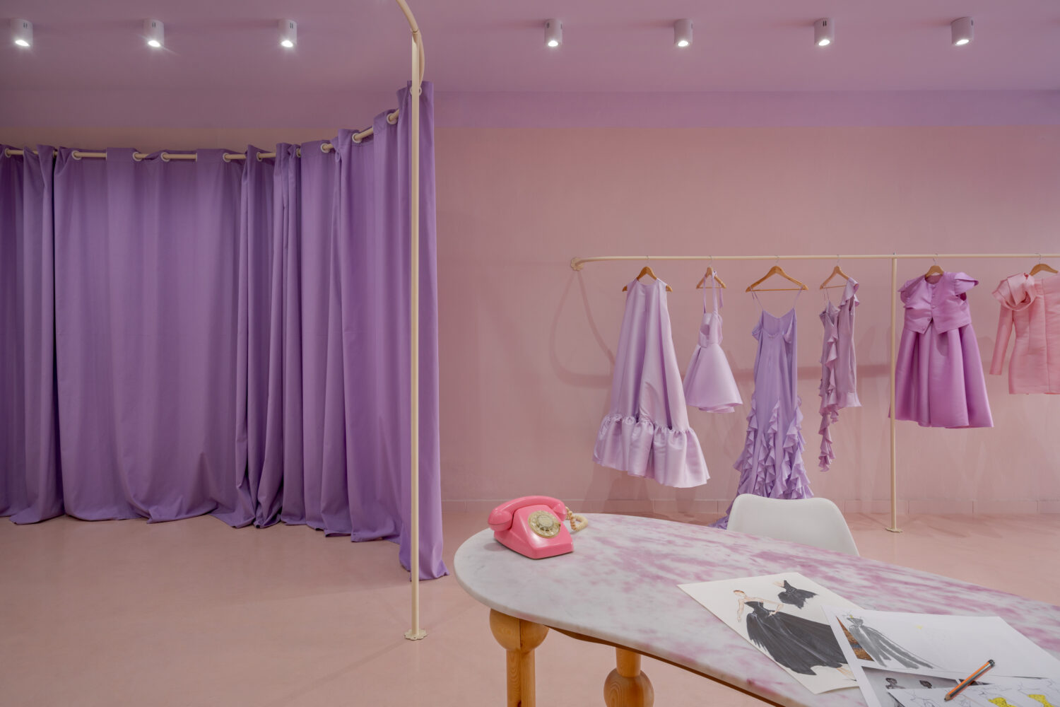 El showroom–atelier de Cristina García, diseñado junto al estudio Cateto Cateto, traduce la identidad de la firma en un espacio fluido y sensorial. Con solo 80 m², el proyecto combina materiales naturales, curvas suaves y una paleta de rosas y malvas que evocan la feminidad contemporánea de la diseñadora. Cortinas móviles sustituyen los tabiques, creando una arquitectura versátil donde las prendas se convierten en protagonistas absolutas. Este futurismo clásico refleja a la perfección la esencia de Cristina García: una visión que bebe de la tradición flamenca para proyectarla hacia el futuro.
