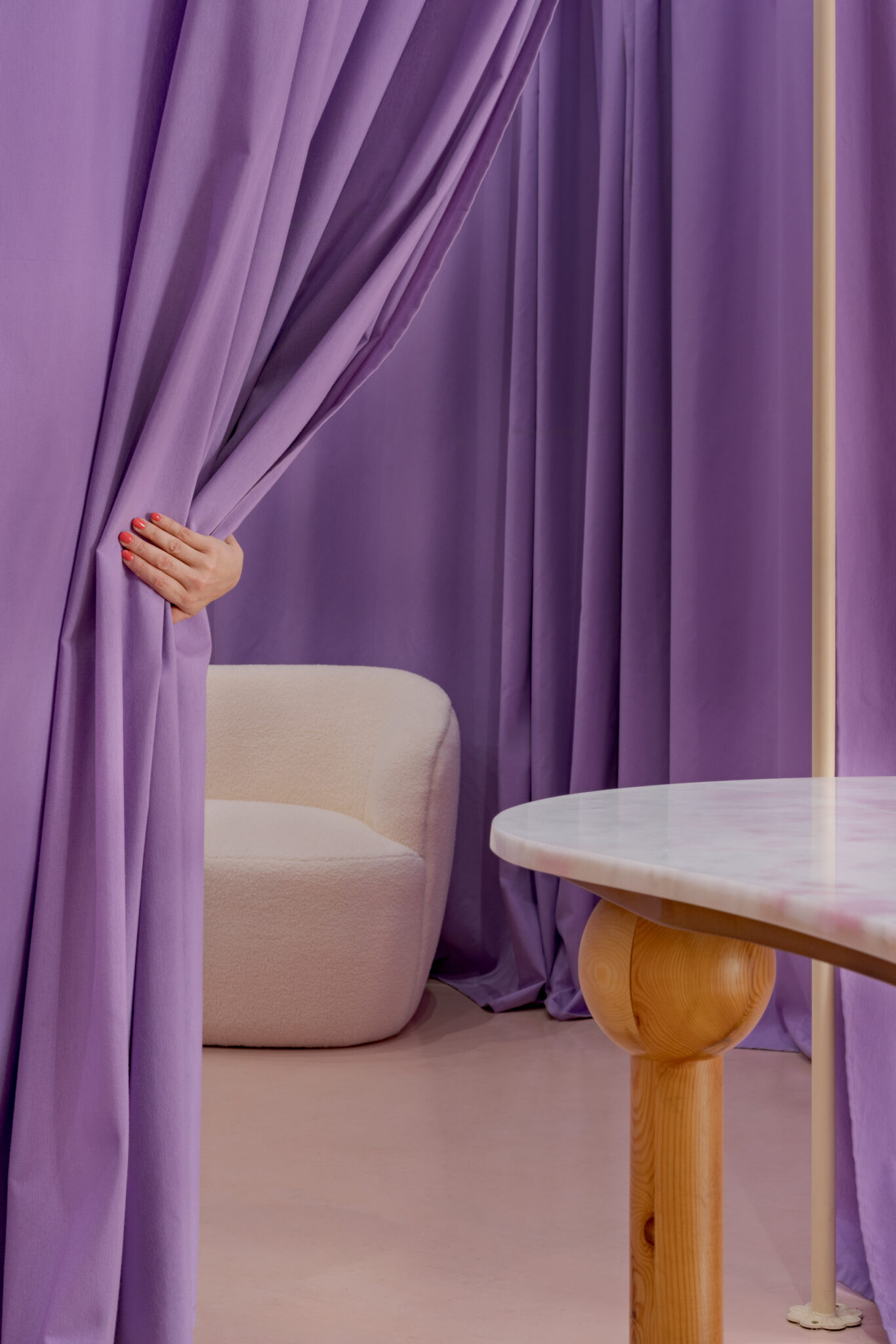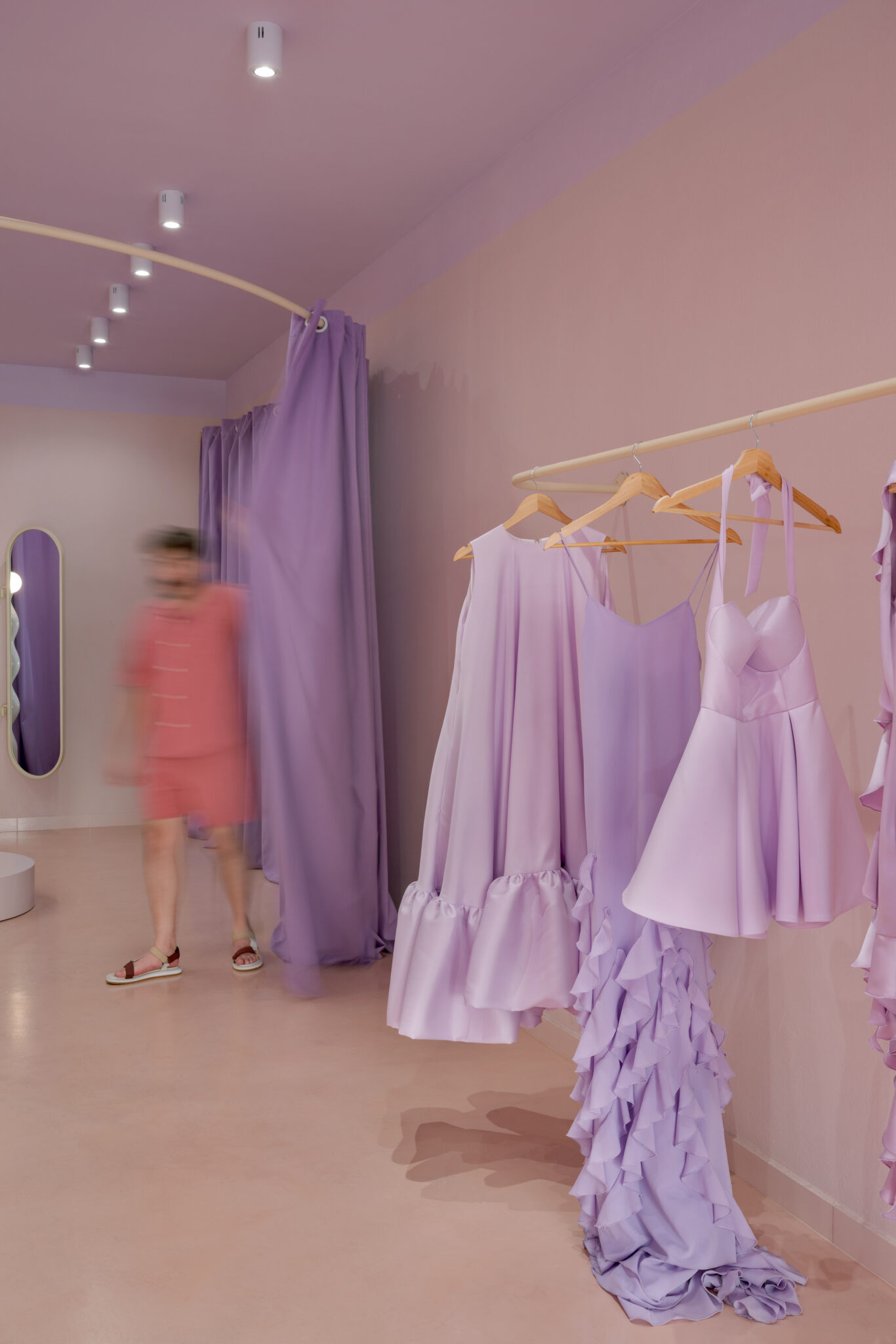 El showroom–atelier de Cristina García, diseñado junto al estudio Cateto Cateto, traduce la identidad de la firma en un espacio fluido y sensorial. Con solo 80 m², el proyecto combina materiales naturales, curvas suaves y una paleta de rosas y malvas que evocan la feminidad contemporánea de la diseñadora. Cortinas móviles sustituyen los tabiques, creando una arquitectura versátil donde las prendas se convierten en protagonistas absolutas. Este futurismo clásico refleja a la perfección la esencia de Cristina García: una visión que bebe de la tradición flamenca para proyectarla hacia el futuro.