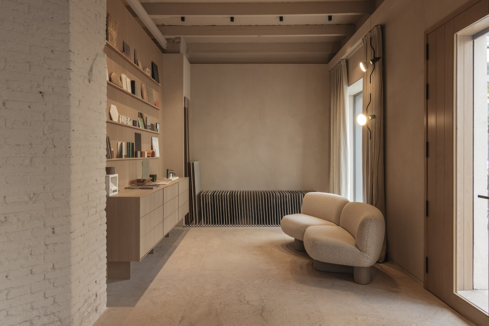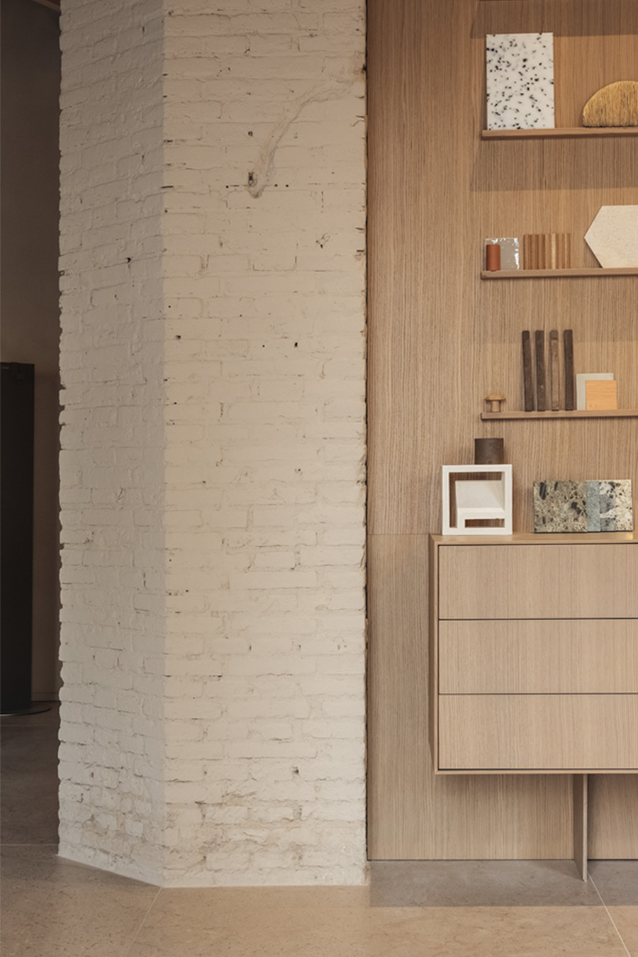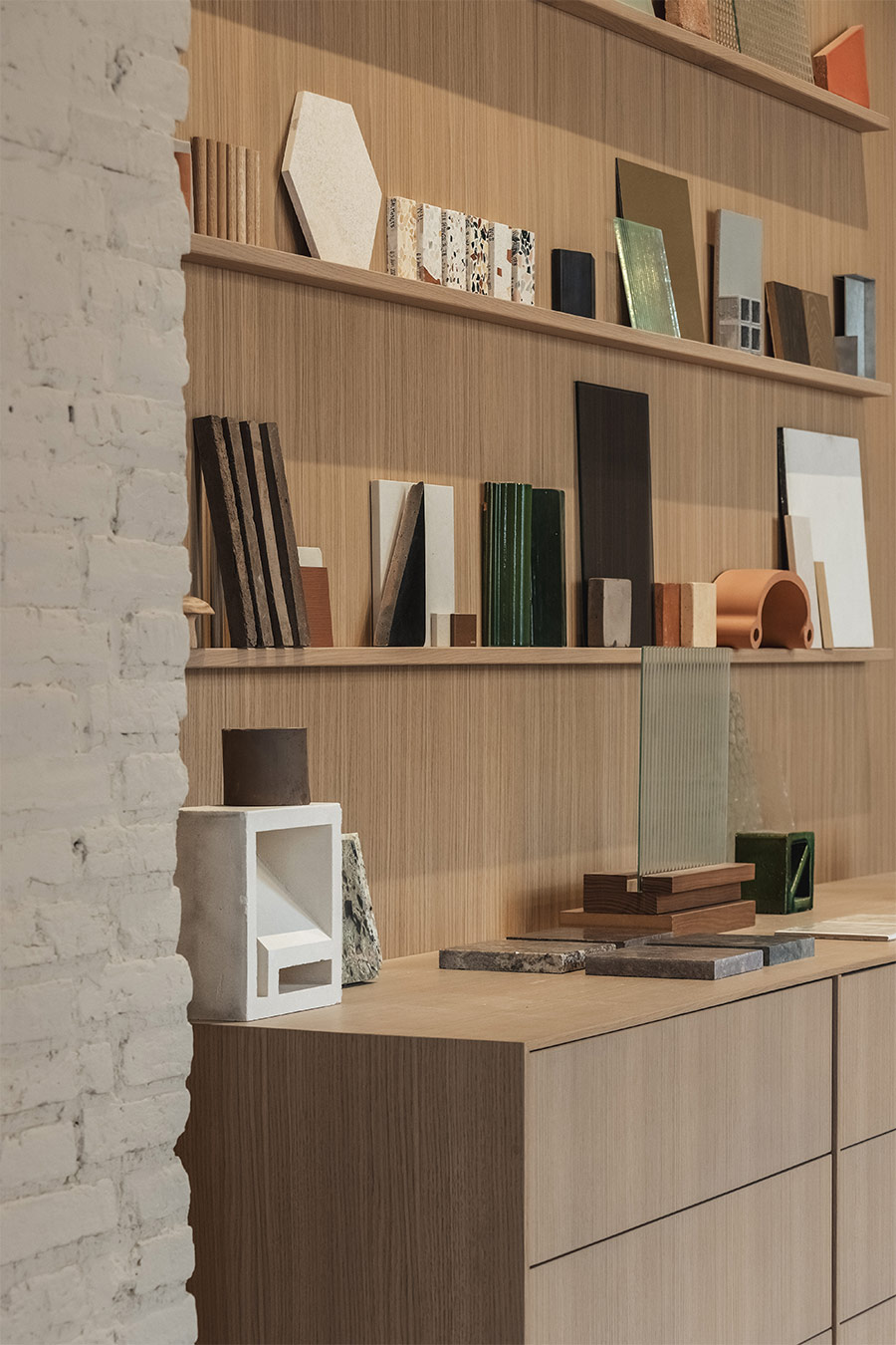 Uno de los espacios clave del proyecto es la zona de muestras, concebida no como un área expositiva convencional, sino como una herramienta activa dentro del proceso creativo. Estanterías integradas albergan materiales, acabados y piezas seleccionadas que forman parte del día a día del estudio. Este espacio funciona como punto de diálogo con el cliente, donde las decisiones se toman desde la experiencia tangible, compartiendo procesos, probando combinaciones y construyendo conjuntamente cada proyecto. Más que mostrar, se trata de trabajar con el material como elemento central del discurso.