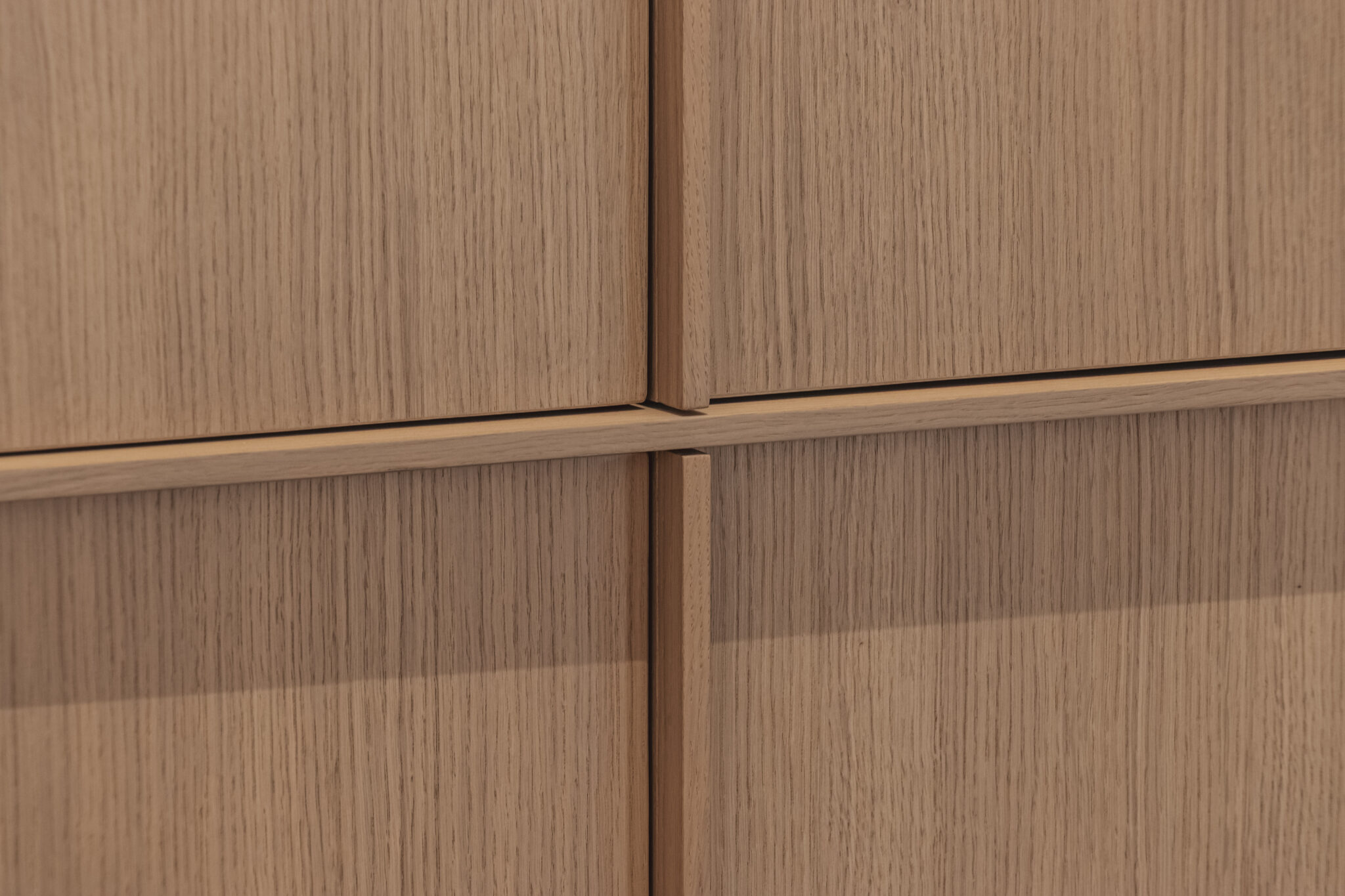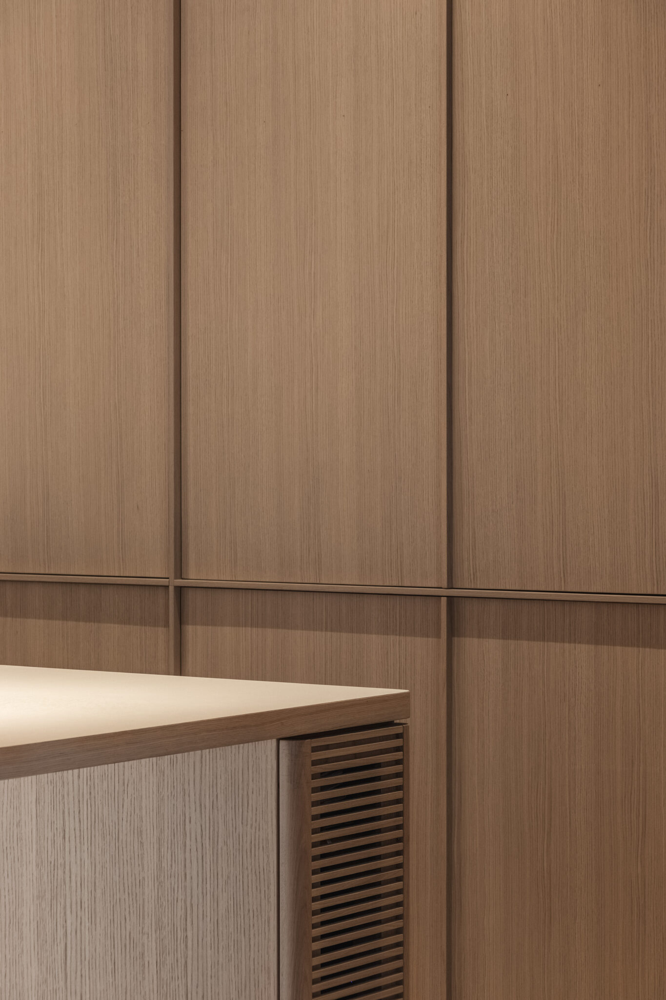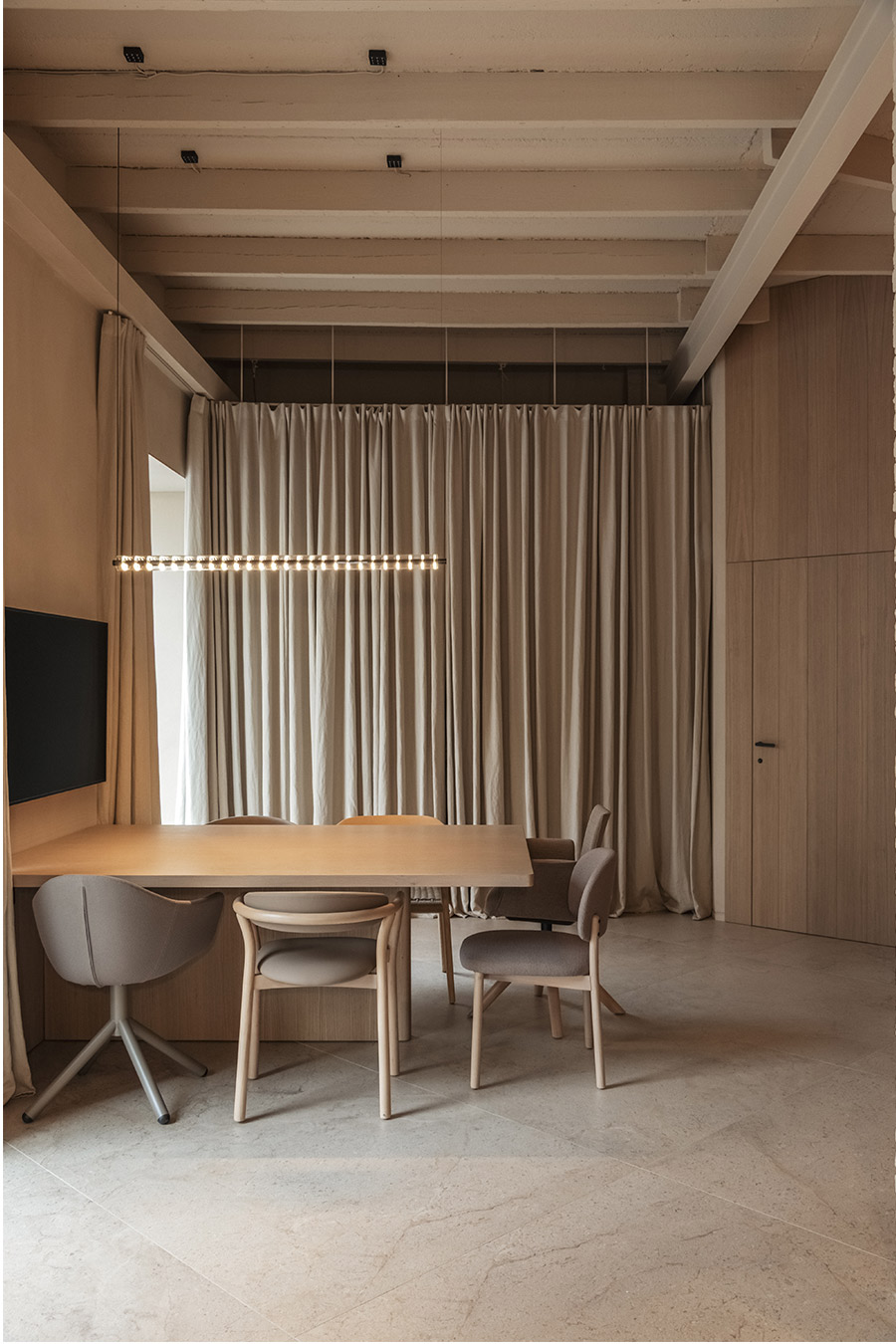 La flexibilidad es uno de los pilares del planteamiento. El mobiliario integrado y las soluciones a medida permiten que los distintos espacios asuman usos cambiantes sin perder coherencia formal. La gran mesa de trabajo actúa como núcleo operativo y punto de encuentro, mientras que las zonas más recogidas ofrecen ámbitos para la conversación pausada o la reflexión individual. El resultado es un equilibrio entre dinamismo y calma, entre productividad y bienestar.