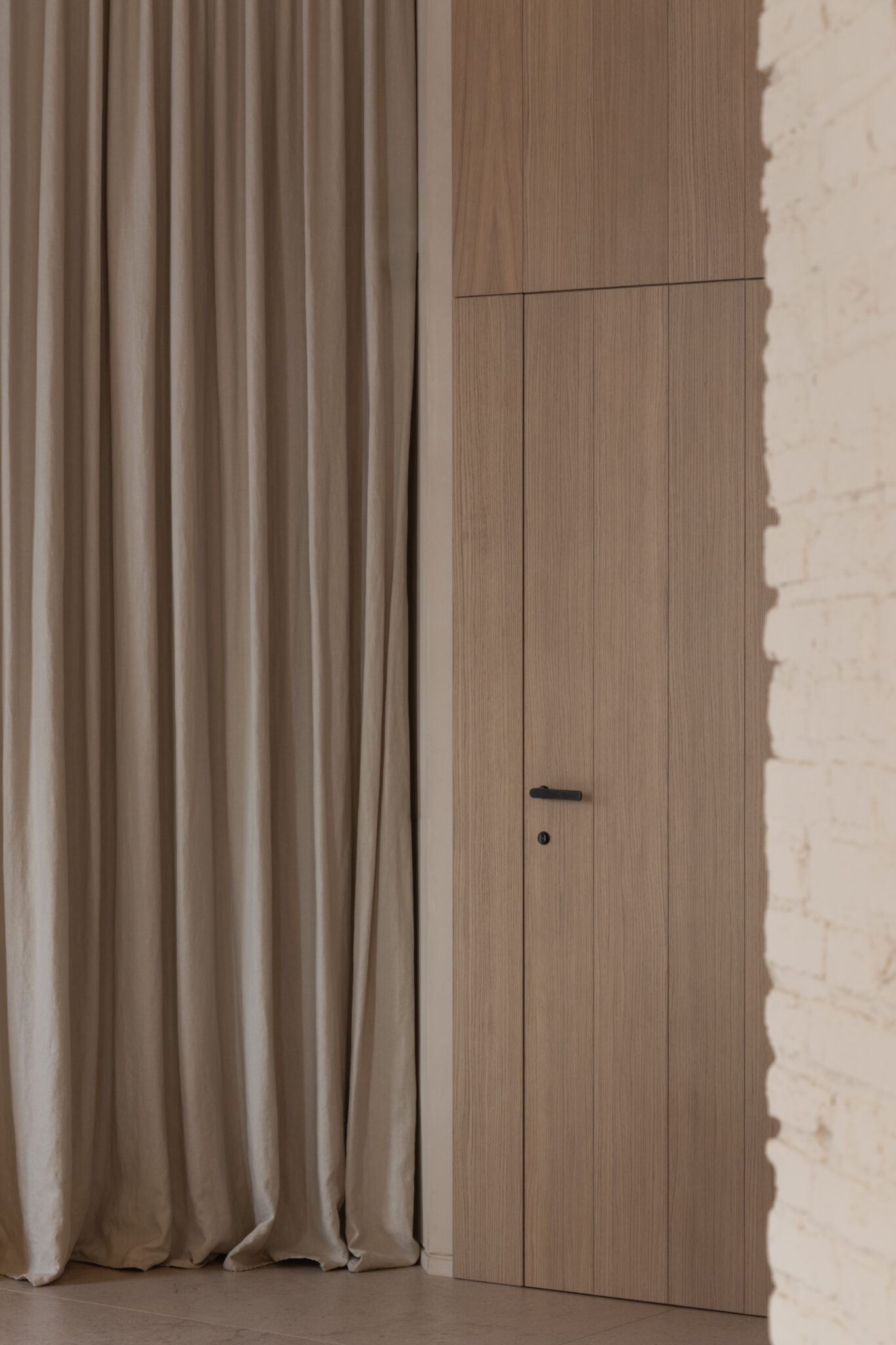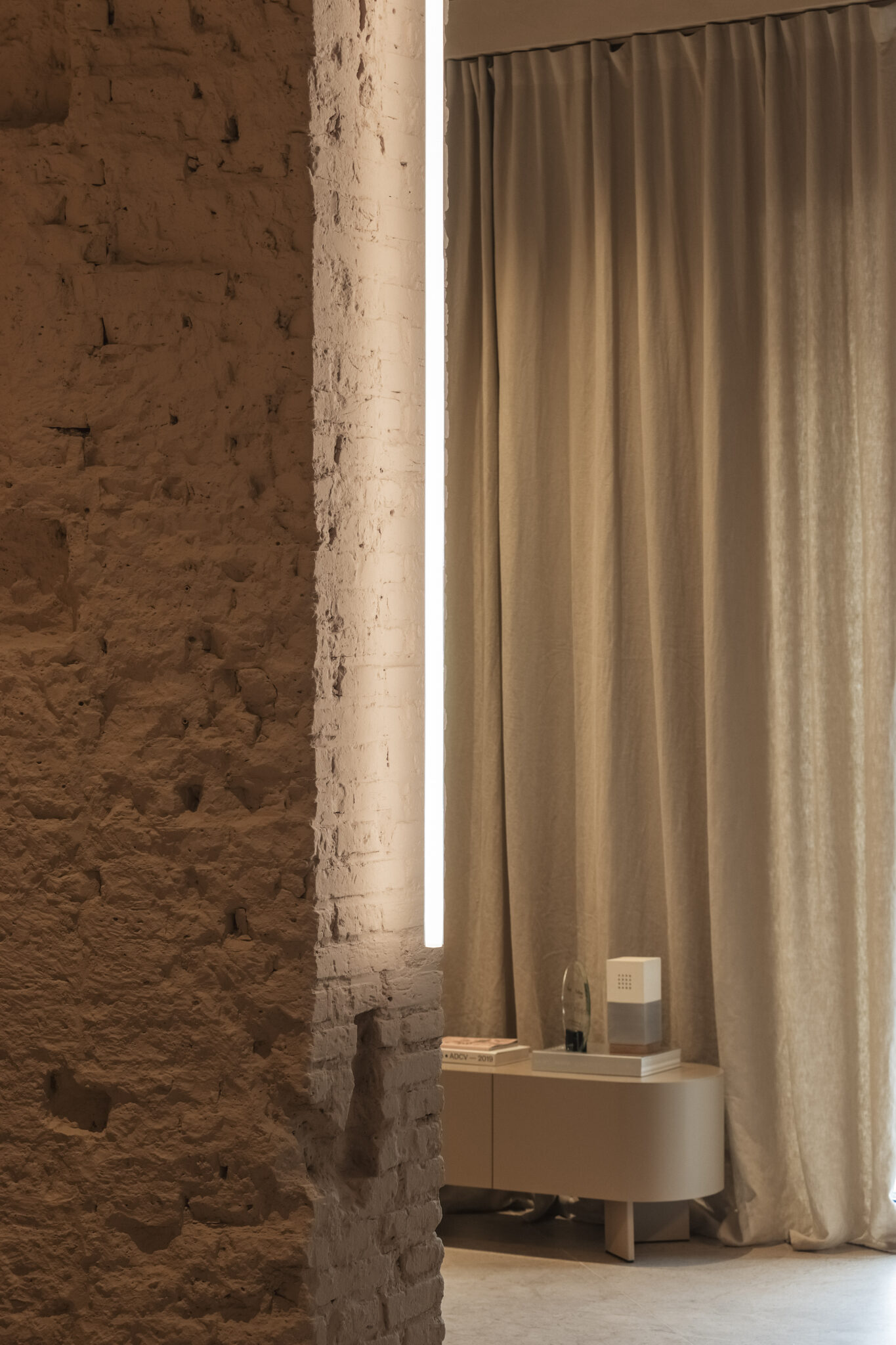 La materialidad desempeña un papel esencial en la construcción de esta atmósfera. La madera se convierte en el hilo conductor del proyecto, presente en revestimientos verticales, almacenamiento, carpinterías y mobiliario diseñado específicamente para el espacio. Su continuidad genera una sensación envolvente y aporta calidez, suavizando la presencia de los elementos estructurales existentes. Estos, lejos de ocultarse, se integran como parte del relato: muros de ladrillo visto, vigas originales y huellas del paso del tiempo conviven con las nuevas intervenciones, reforzando un diálogo equilibrado entre lo preexistente y lo contemporáneo.