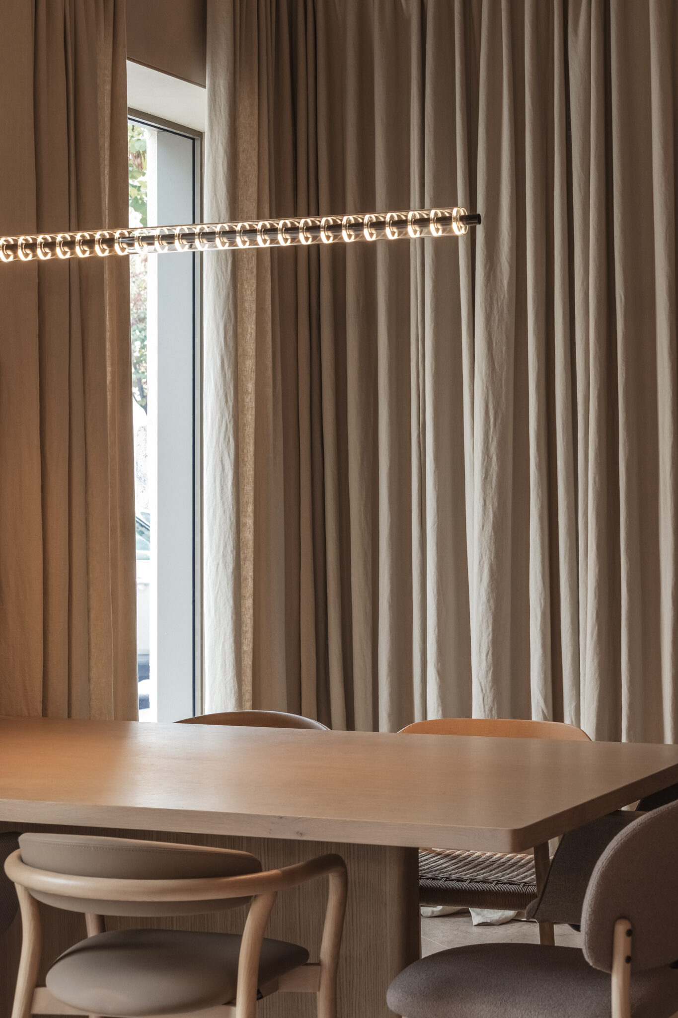 La paleta cromática se mantiene en tonos neutros y naturales, creando una base serena que permite que la luz adquiera protagonismo. La iluminación se concibe como una herramienta estratégica, combinando la entrada de luz natural con puntos de luz artificial cuidadosamente estudiados. Luminarias lineales suspendidas y apliques puntuales acompañan los distintos momentos del día, generando ambientes que evolucionan desde la actividad matinal hasta una atmósfera más íntima al caer la tarde. La luz no solo ilumina; modela el espacio y acentúa texturas, vetas y volúmenes.