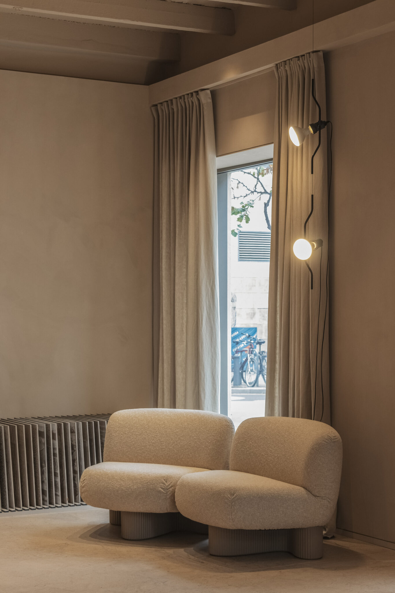 La presencia de textiles ligeros, como cortinas de caída generosa, contribuye a modular la luz y aportar confort acústico, reforzando la sensación de calma. Cada elemento responde a una intención clara: reducir el ruido visual, priorizar la calidad espacial y favorecer una experiencia amable tanto para el equipo como para quienes visitan el estudio.