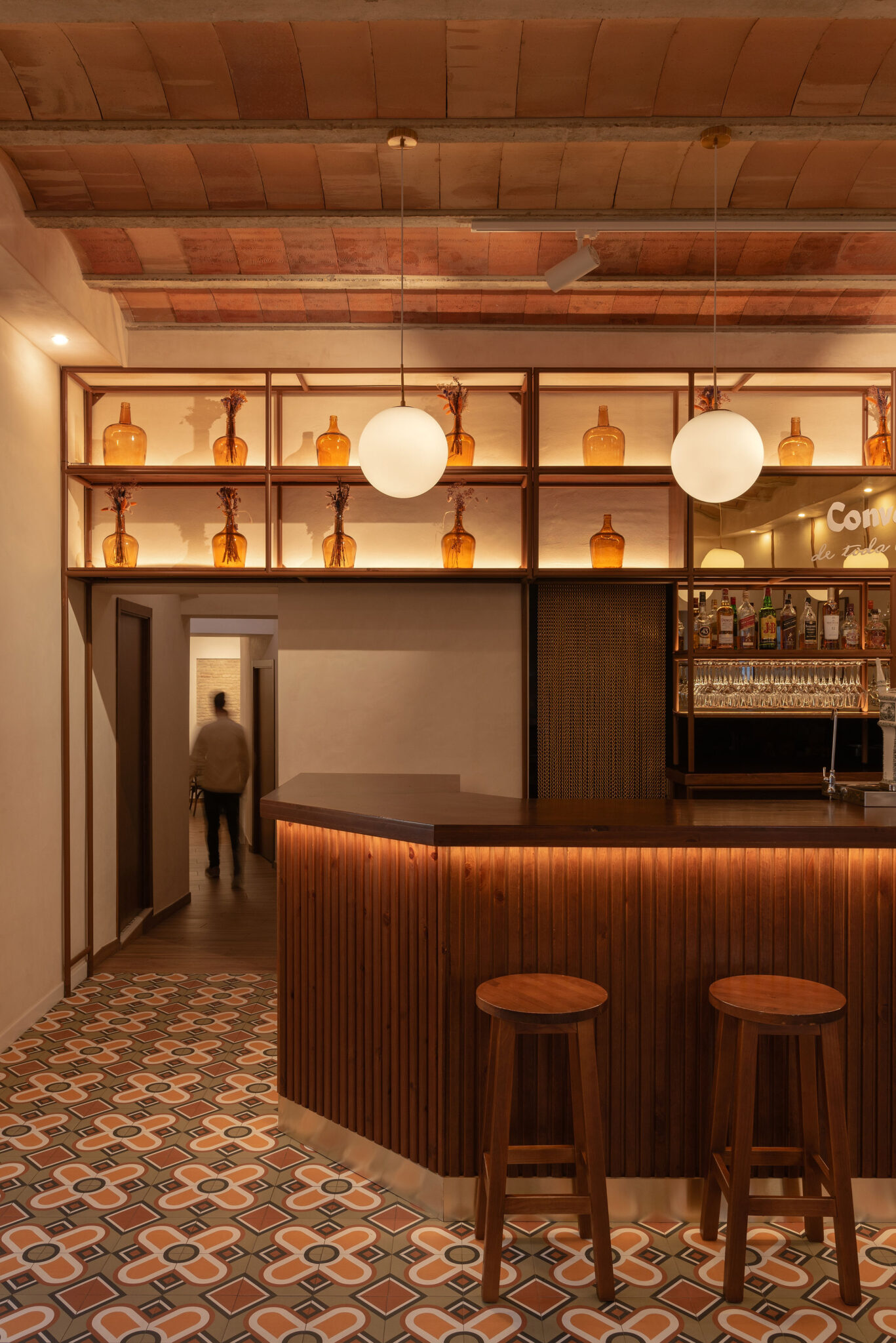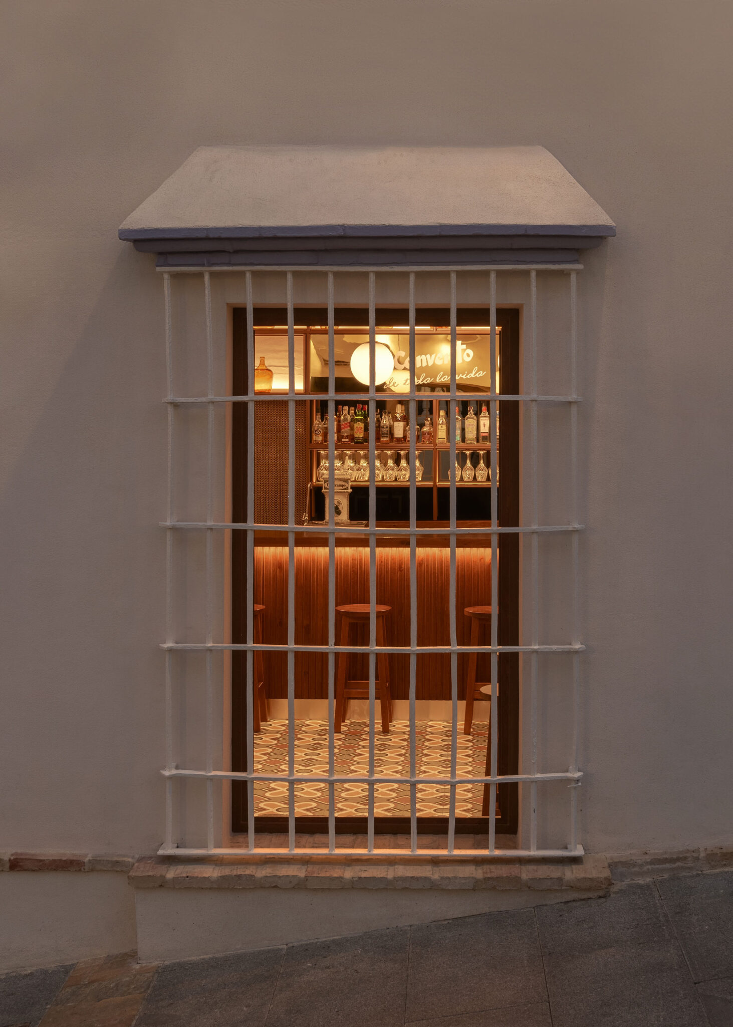 El proyecto de reforma nació de manera natural: no se trataba de inventar nada nuevo, sino de rescatar la esencia de una taberna “de toda la vida”. Por eso se recuperaron materiales y acabados auténticos de las clásicas tabernas sevillanas: la barra de madera robusta, el mortero de cal en las paredes, las baldosas hidráulicas que dibujan geometrías en el suelo y, por supuesto, las damajuanas que evocan tiempos de vino servido a granel.