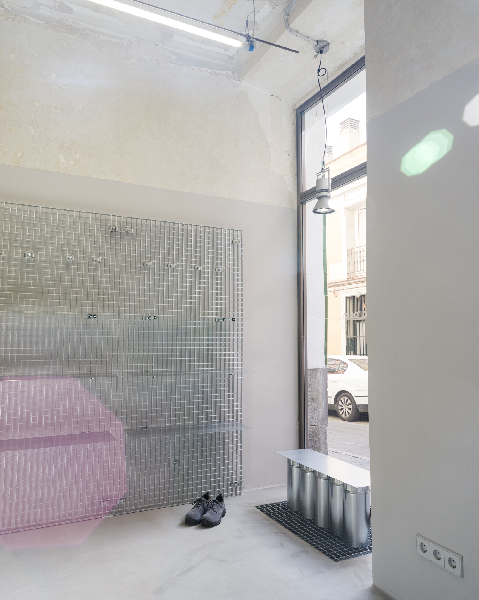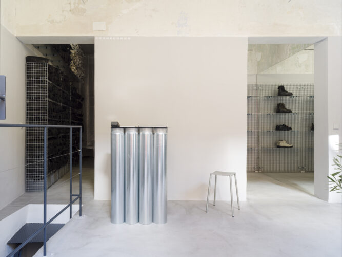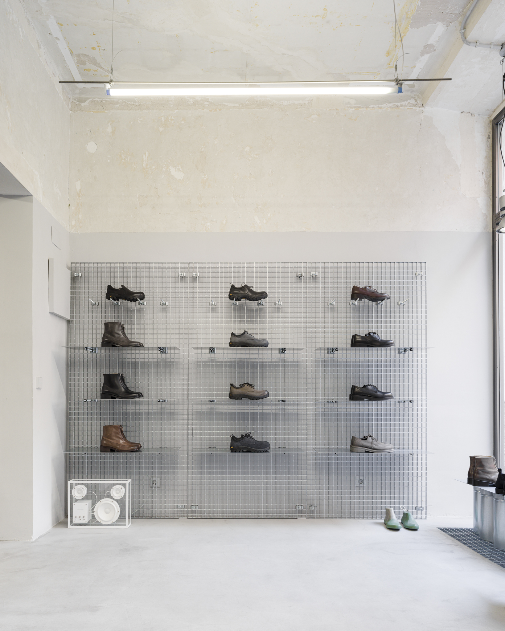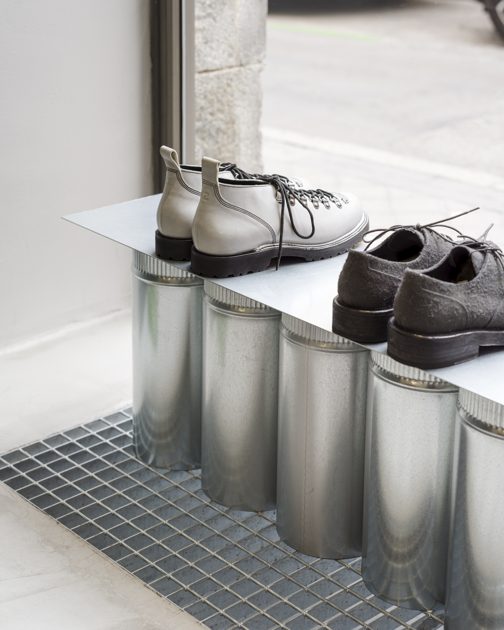 En la segunda fase, el estudio diseñó y fabricó a medida los expositores e iluminación en su propio taller. La búsqueda se centró en elementos industriales accesibles —acero galvanizado, varillas roscadas, gomas de caucho reciclado— reinterpretados de forma modular y precisa. Estas soluciones, ensambladas en seco, ofrecen un sistema flexible que puede modificarse y reconfigurarse con el tiempo, otorgando ligereza visual al espacio y enfatizando la pureza del calzado expuesto.