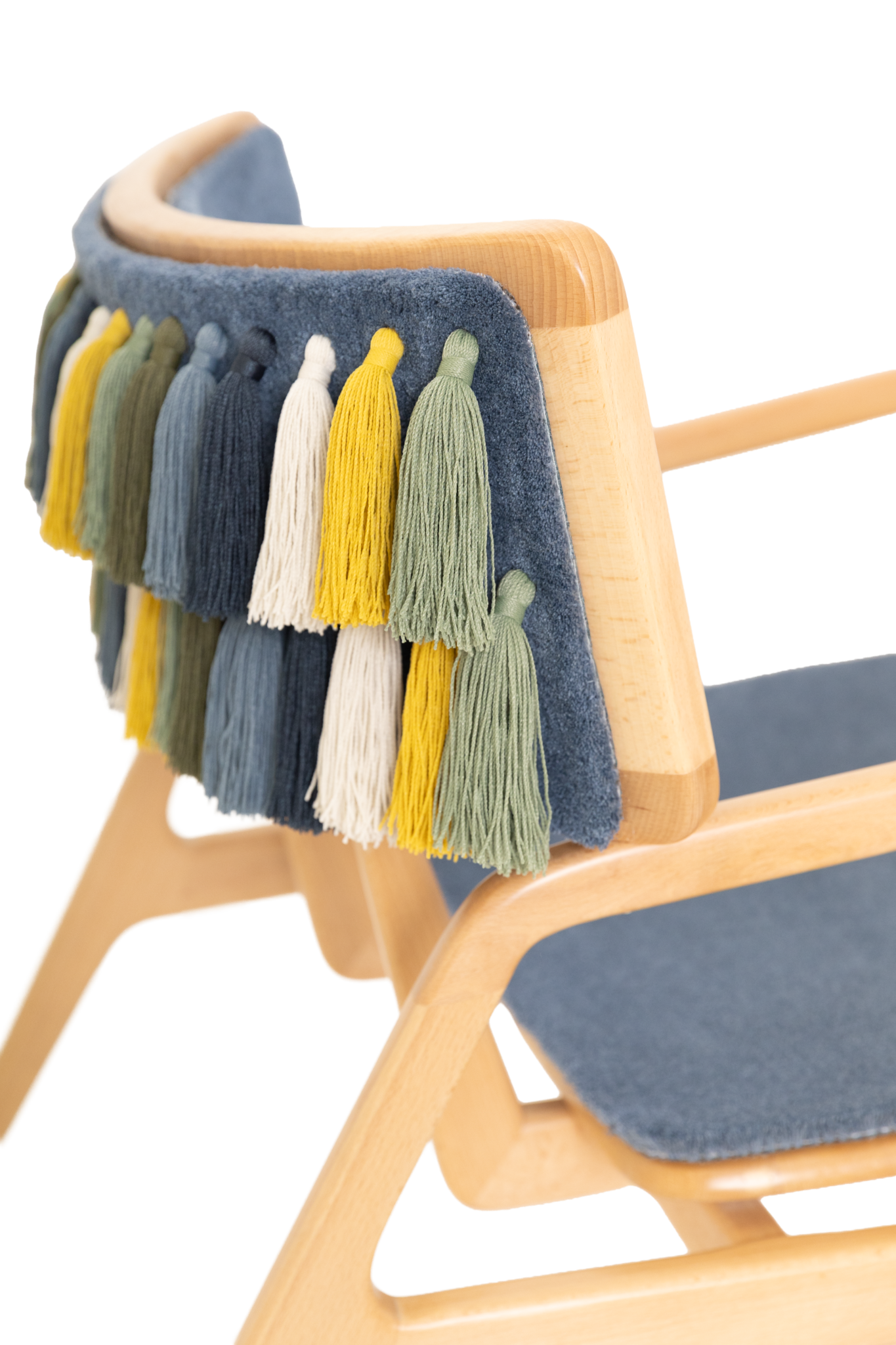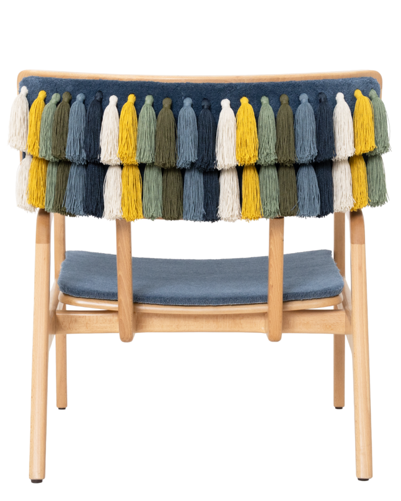 La silla Rondina Al’m’ar nace de una colaboración entre Rondinart, Craft Gardens y Tapetes Beiriz para crear una pieza que transforma tradición en innovación. La estructura de madera, los borlas hechas con hilo ECONYL regenerado y la superficie en tufting portugués forman un objeto que funciona simultáneamente como mobiliario y escultura sensorial.