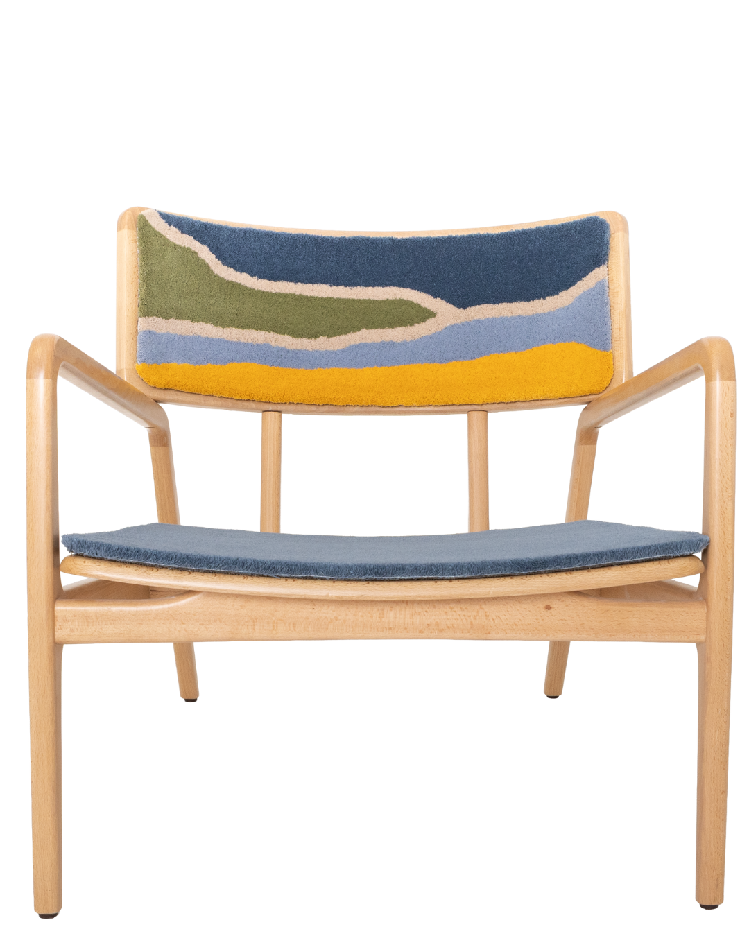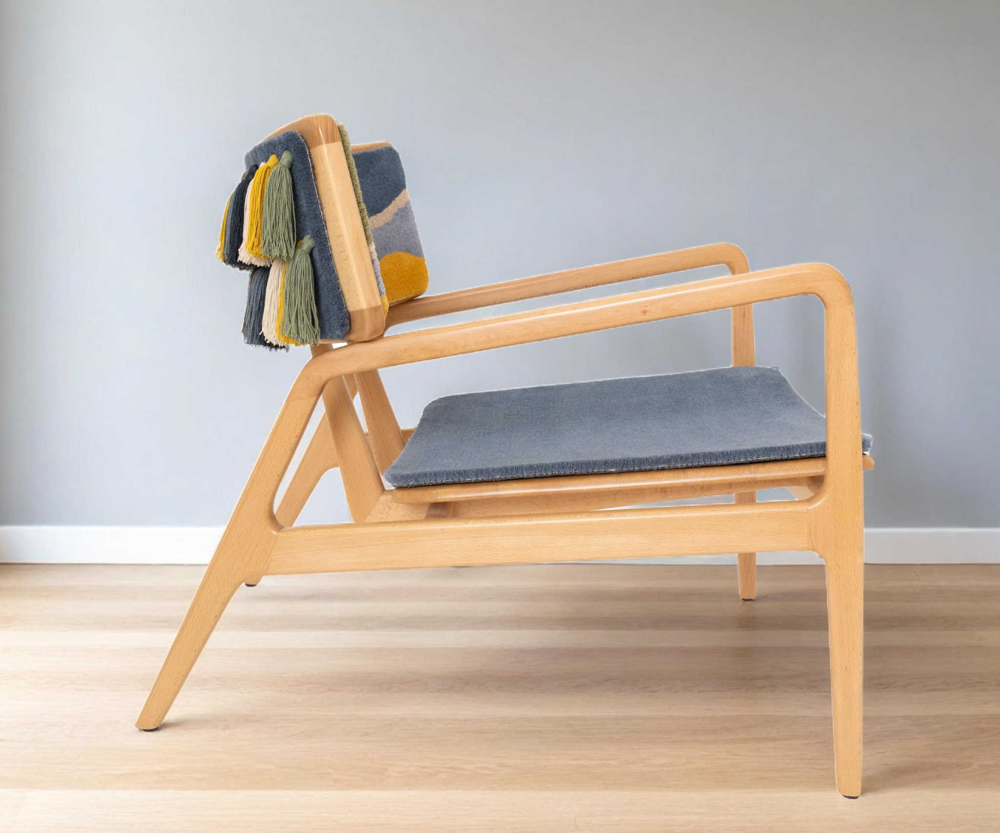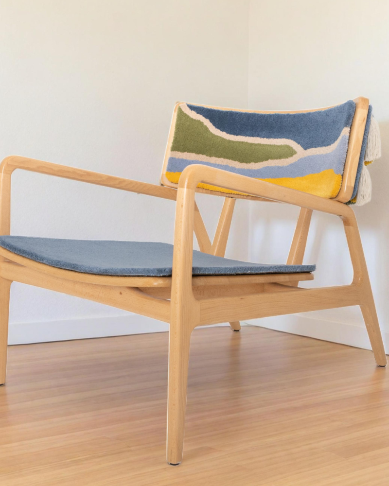 Tapetes Beiriz desarrolló las superficies textiles que sirven de base al respaldo y al asiento de la silla. La técnica de tufting evoca identidad, textura y memoria cultural, creando el soporte para la expresión escultórica de la pieza.