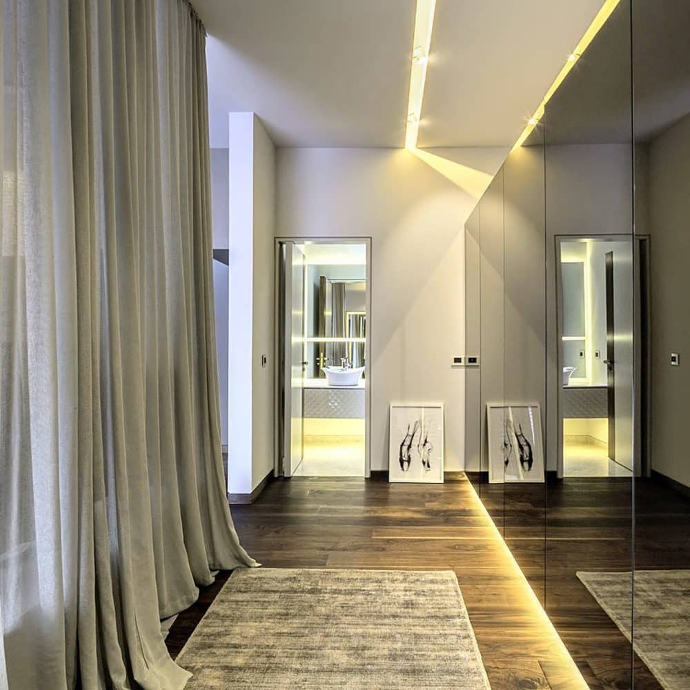 Las paredes que envuelven esta área se funden en el diseño para aportar amplitud por medio de los espejos, y dar continuidad con las puertas de lujo de los closets de Kitchen Studio.