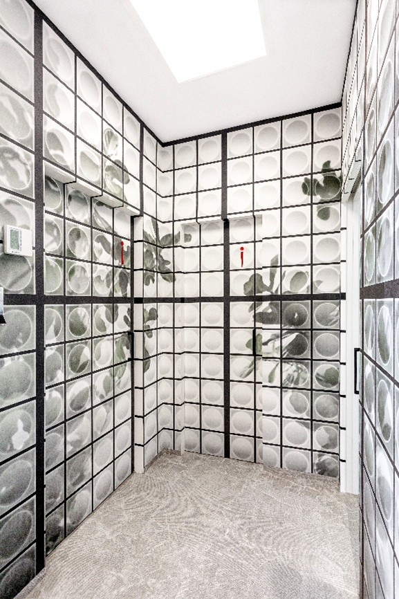 Inspirado en la prestigiosa piedra extraída de las canteras de la Toscana, el modelo Carrara reproduce marcadas vetas blancas sobre un tono base atenuado, evocando la nobleza del mármol utilizado por el Imperio Romano en la construcción de templos y monumentos. Este patrón aporta al espacio una imagen elegante y atemporal, perfectamente integrada en el diseño monocromático de la tienda concebido por Alfonso Castellón, donde el gris actúa como hilo conductor del interiorismo y la madera de los muebles aporta calidez al conjunto.