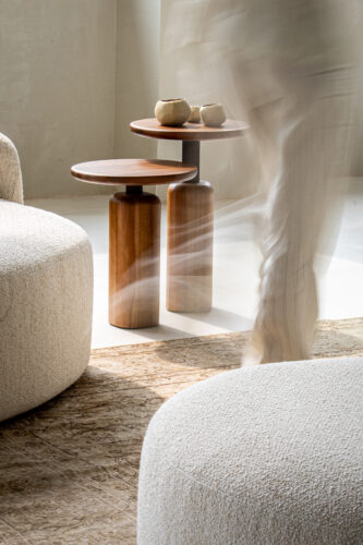 Bruna emplea texturas naturales, desde lino y algodón hasta madera reciclada y piedra en bruto. Así, pasado y presente se encuentran de nuevo, invitando a los visitantes a sumergirse en este universo de recuerdos, no solo visualmente, sino también a través del tacto.