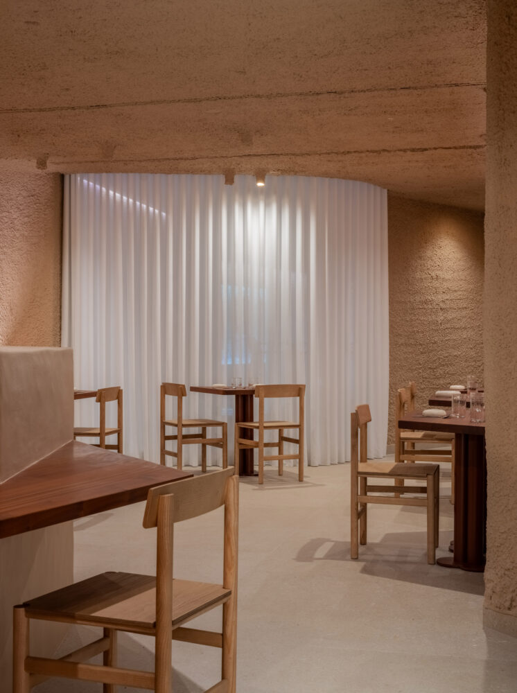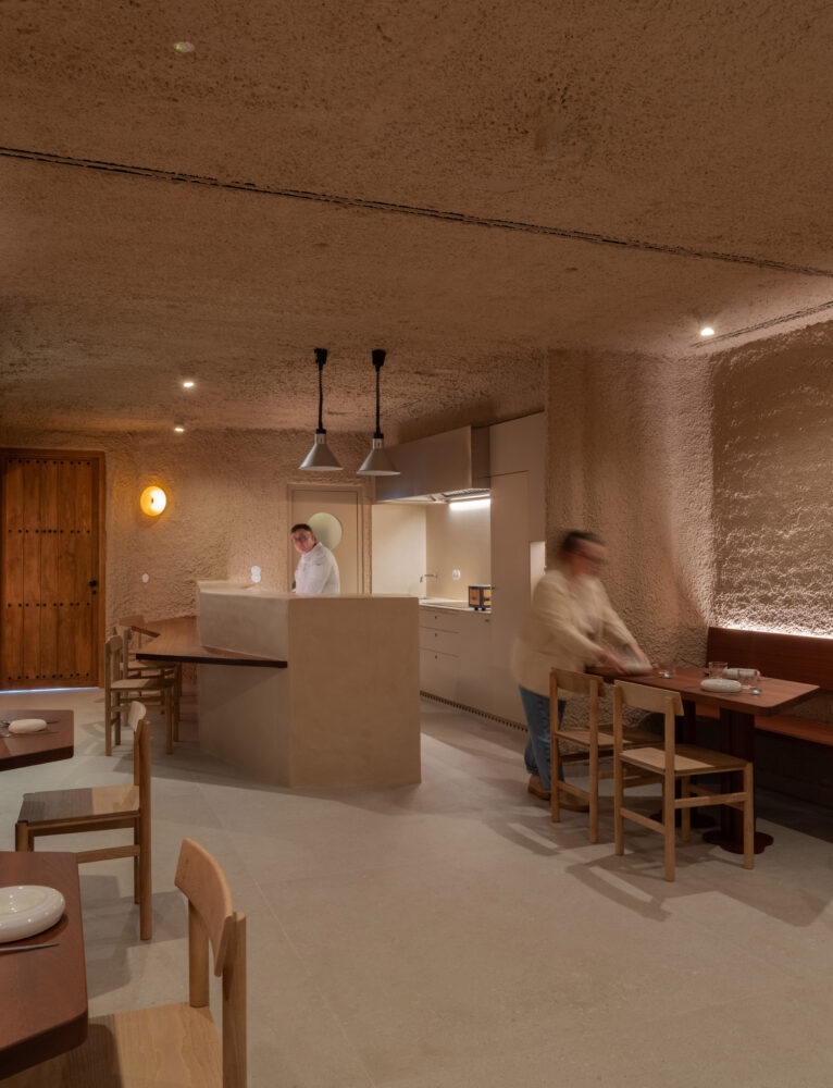 El nuevo proyecto de interiorismo combina materiales contemporáneos —yeso en tonos cálidos, madera oscura, iluminación tenue— con referencias a la arquitectura árabe, creando un ambiente acogedor y sofisticado. La cocina vista y la barra serpenteante invitan a la interacción, mientras las mesas modulares inspiradas en Montessori y Tangram permiten una configuración flexible del espacio.