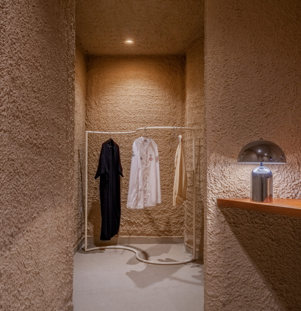 El yeso proyectado en tono marrón suave remite a las murallas descarnadas de cal. La iluminación tenue y cálida recuerda a la de las musealizaciones, transportándonos a una medina nocturna iluminada por farolillos y lámparas de aceite. La madera oscura aporta un matiz exótico y, al trabajarse en tablas, evoca la construcción en tapial de murallas y torres. Las formas orgánicas y curvilíneas rememoran las calles y trazados intrincados de las antiguas medinas árabes.