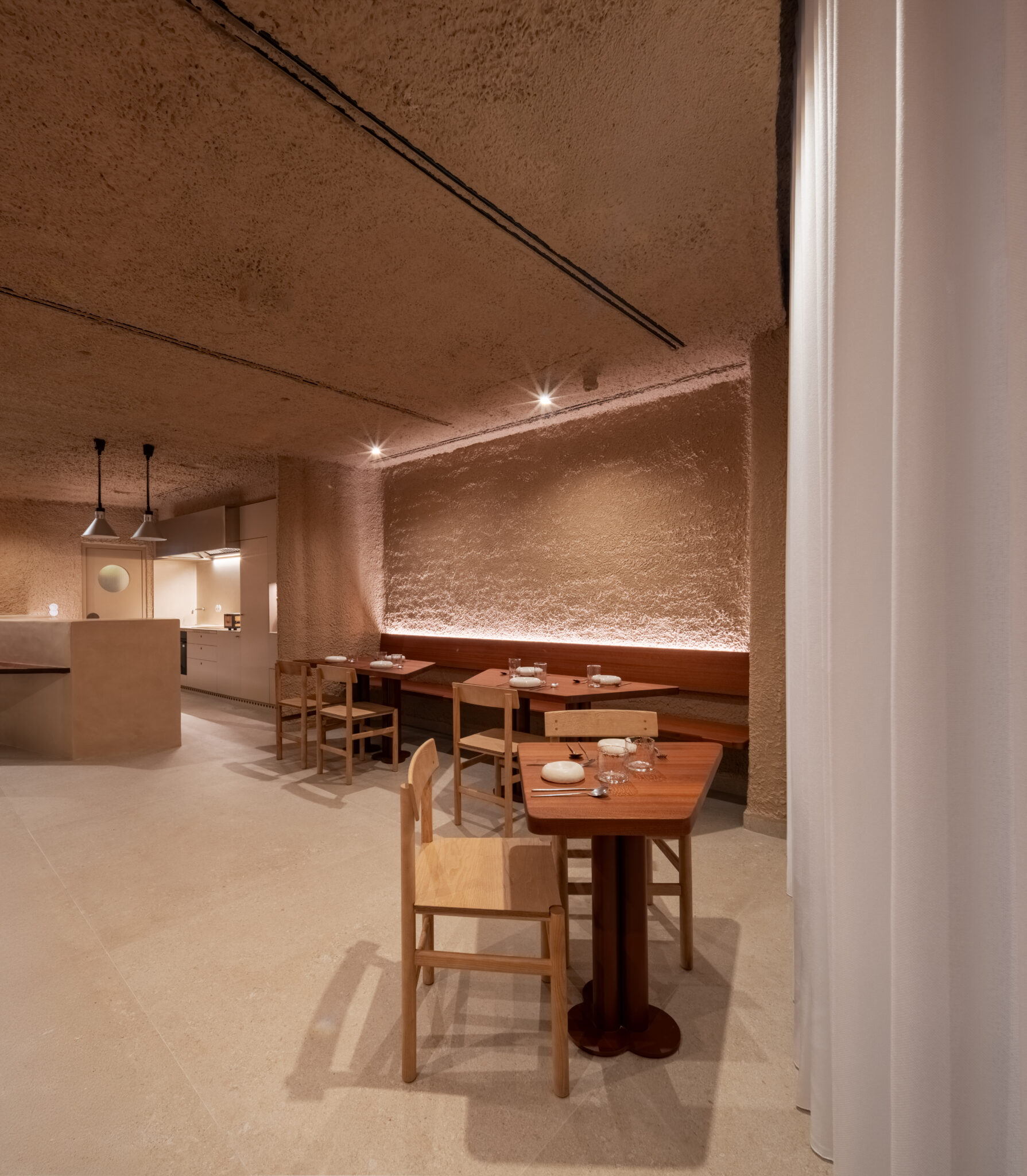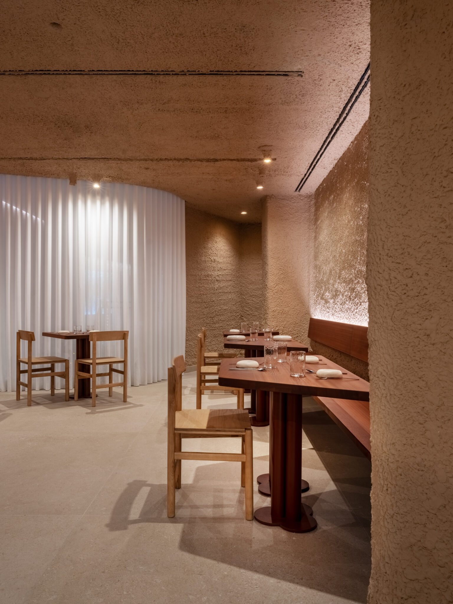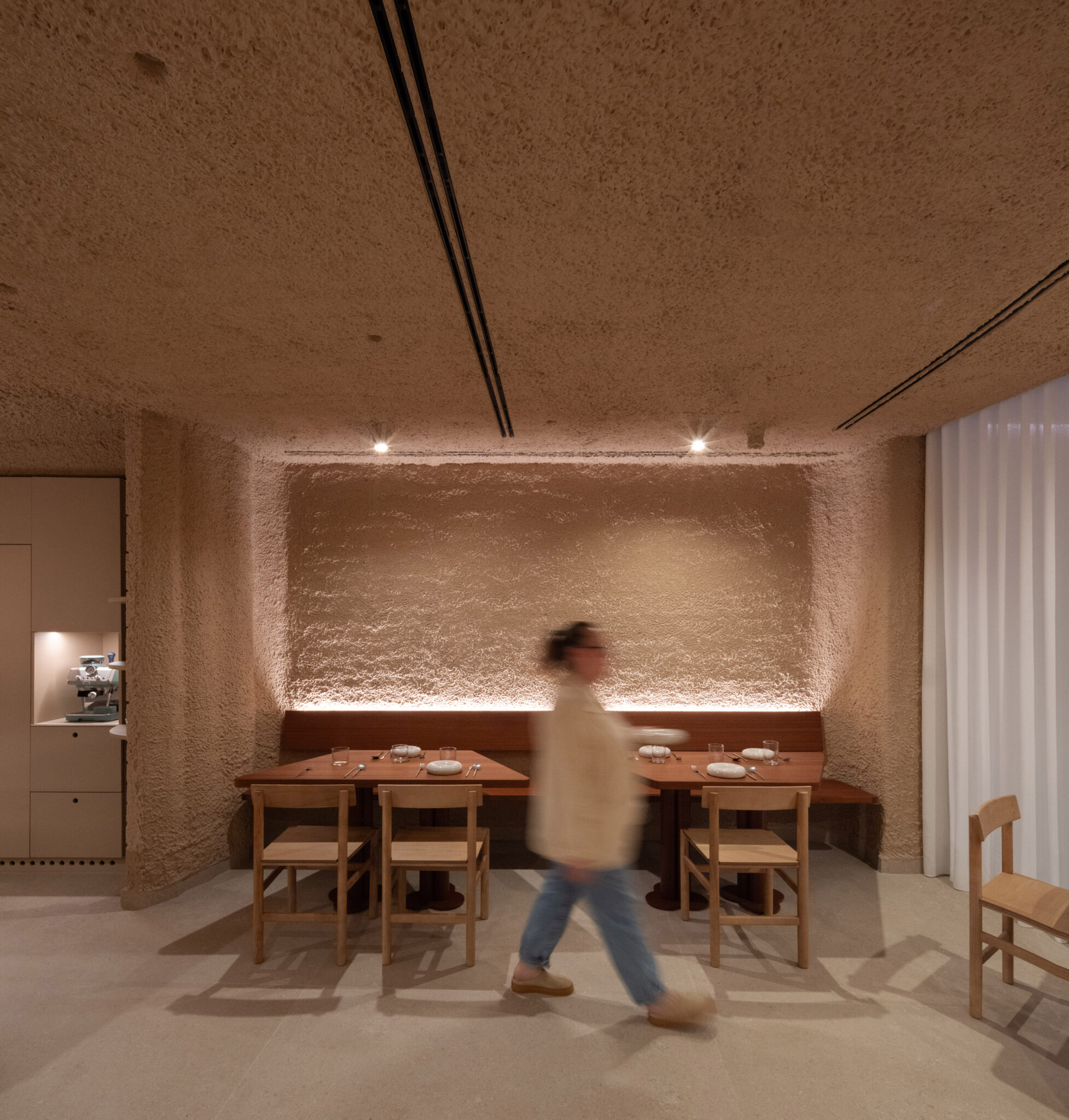 El nuevo proyecto de interiorismo combina materiales contemporáneos —yeso en tonos cálidos, madera oscura, iluminación tenue— con referencias a la arquitectura árabe, creando un ambiente acogedor y sofisticado. La cocina vista y la barra serpenteante invitan a la interacción, mientras las mesas modulares inspiradas en Montessori y Tangram permiten una configuración flexible del espacio.