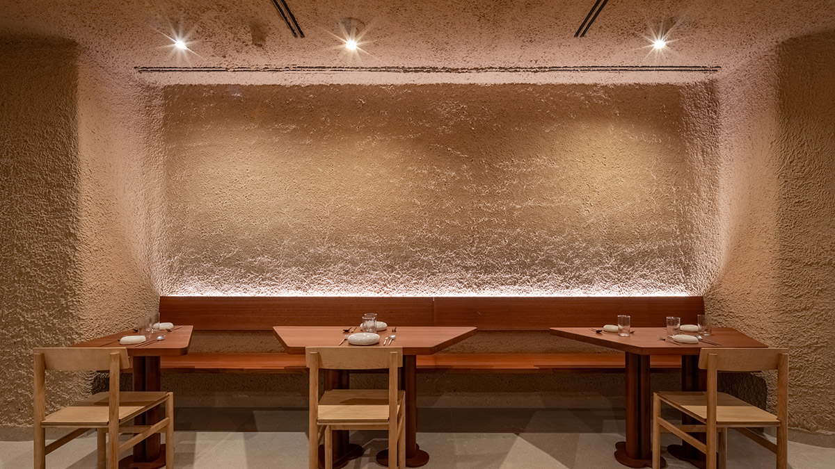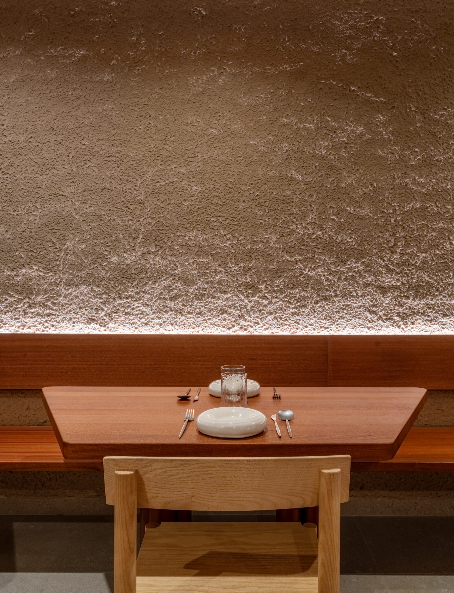 La cocina abierta recibe al comensal con una barra japonesa en forma serpenteante, que avanza y retrocede para invitar al diálogo entre clientes y cocinero. Aquí, el concepto de “ver sin ser visto” se materializa en una barra de tres alturas combinando madera, microcemento y acero.