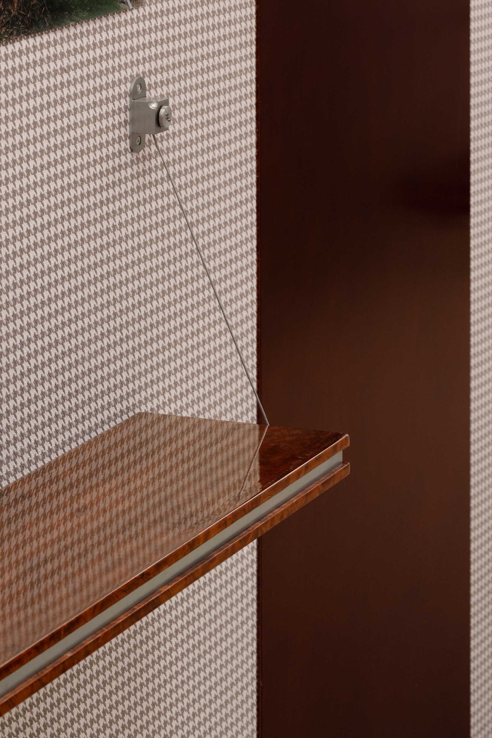 Una oficina elegante, impregnada de un romanticismo vintage, se extiende a lo largo del pasillo, con paredes de archivo cubiertas en tela de pata de gallo y detalles de accesorios característicos de la marca. Pósteres alineados en sucesión y estantes de madera de raíz que asemejan escritorios de oficina crean un ritmo marcado, guiando a los visitantes a sumergirse en este «viaje a través del tiempo y el espacio.»