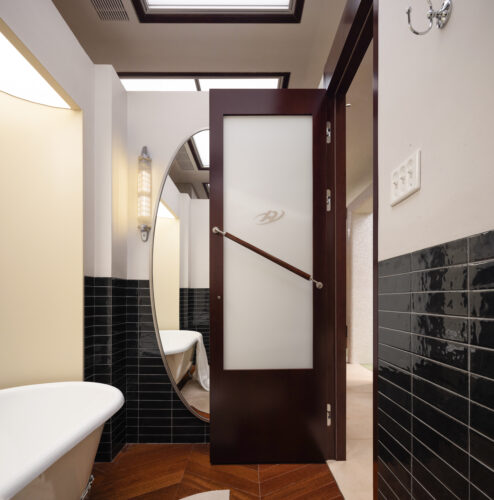 Una bañera vintage y azulejos de mosaico evocan un sentido de misterio dentro de este espacio privado, despojando las identidades diarias para redescubrir la conexión entre la autoconciencia y la moda.