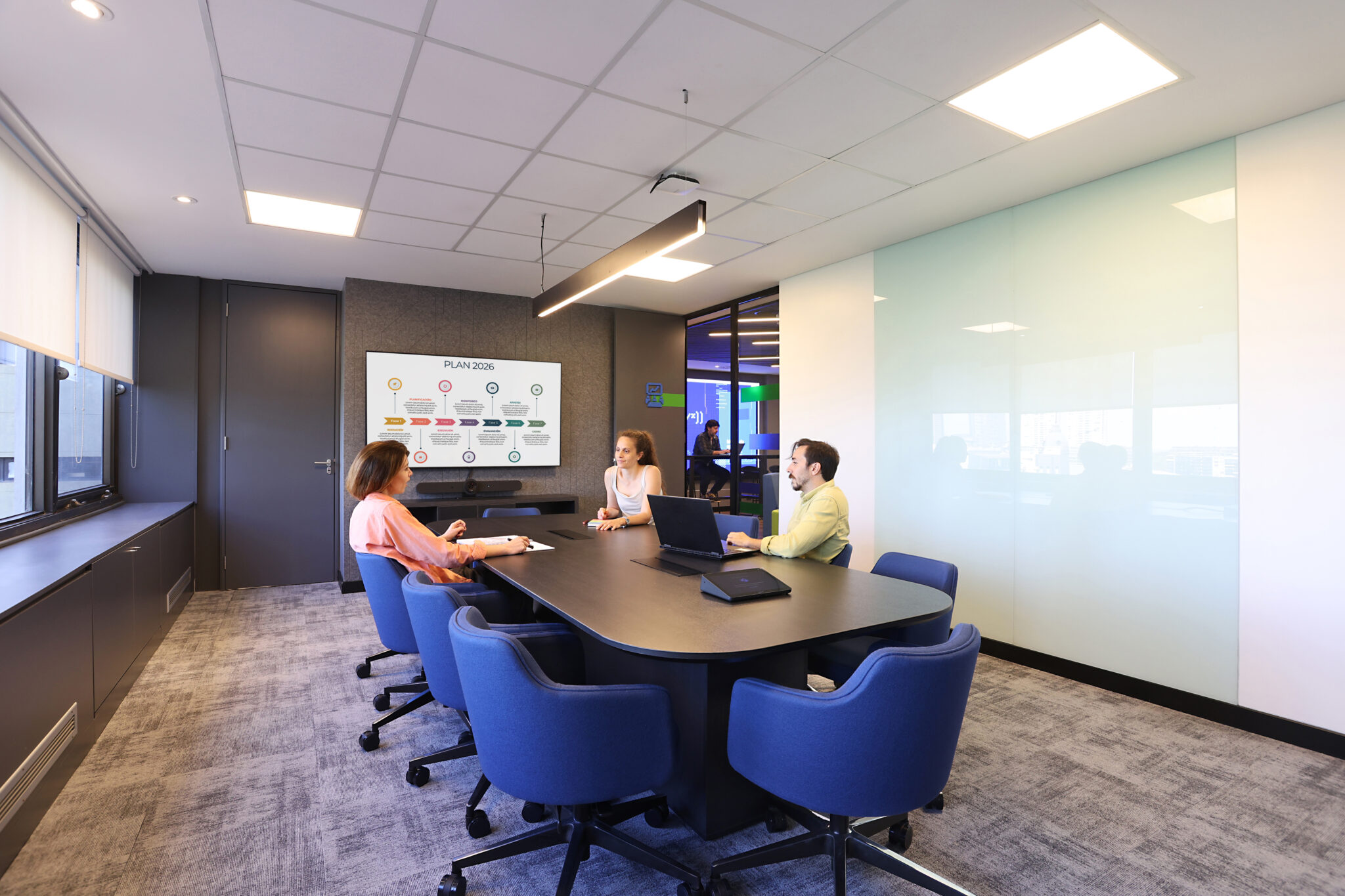 Más allá de su escala, la oficina se percibe amplia y organizada. La circulación fluye naturalmente entre áreas abiertas y cerradas, favoreciendo la claridad espacial.