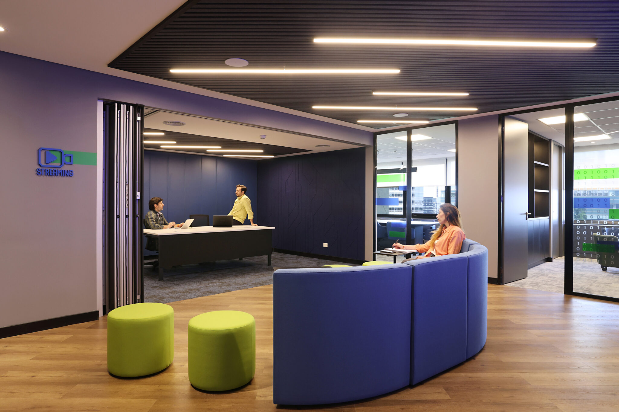 En una empresa donde la concentración y la confidencialidad son fundamentales, el diseño equilibra apertura y privacidad. Las salas cerradas actúan como piezas articuladoras, permitiendo alternar entre intercambio colectivo y trabajo profundo.