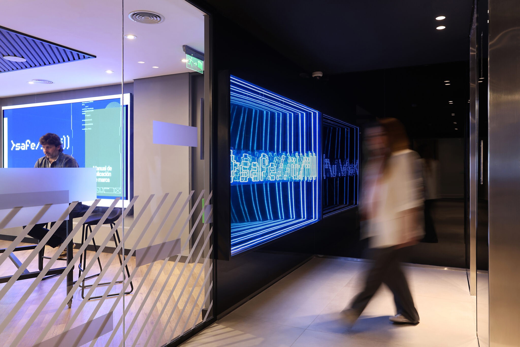 Video wall acceso oficina corporativa tecnológica