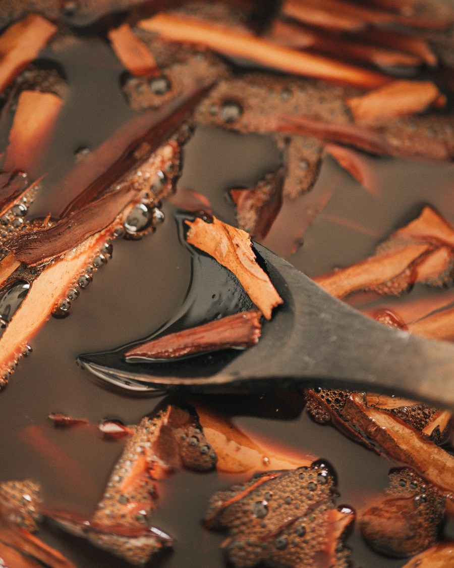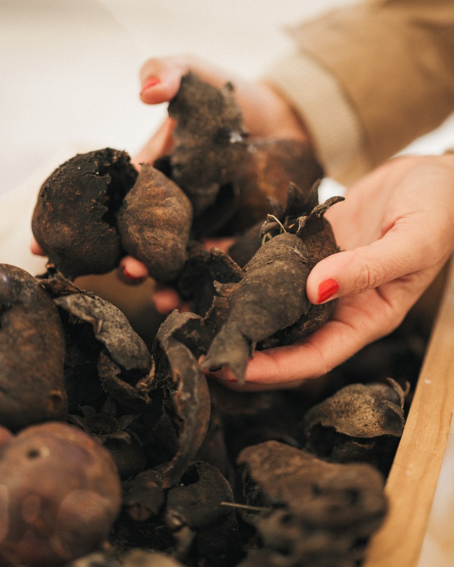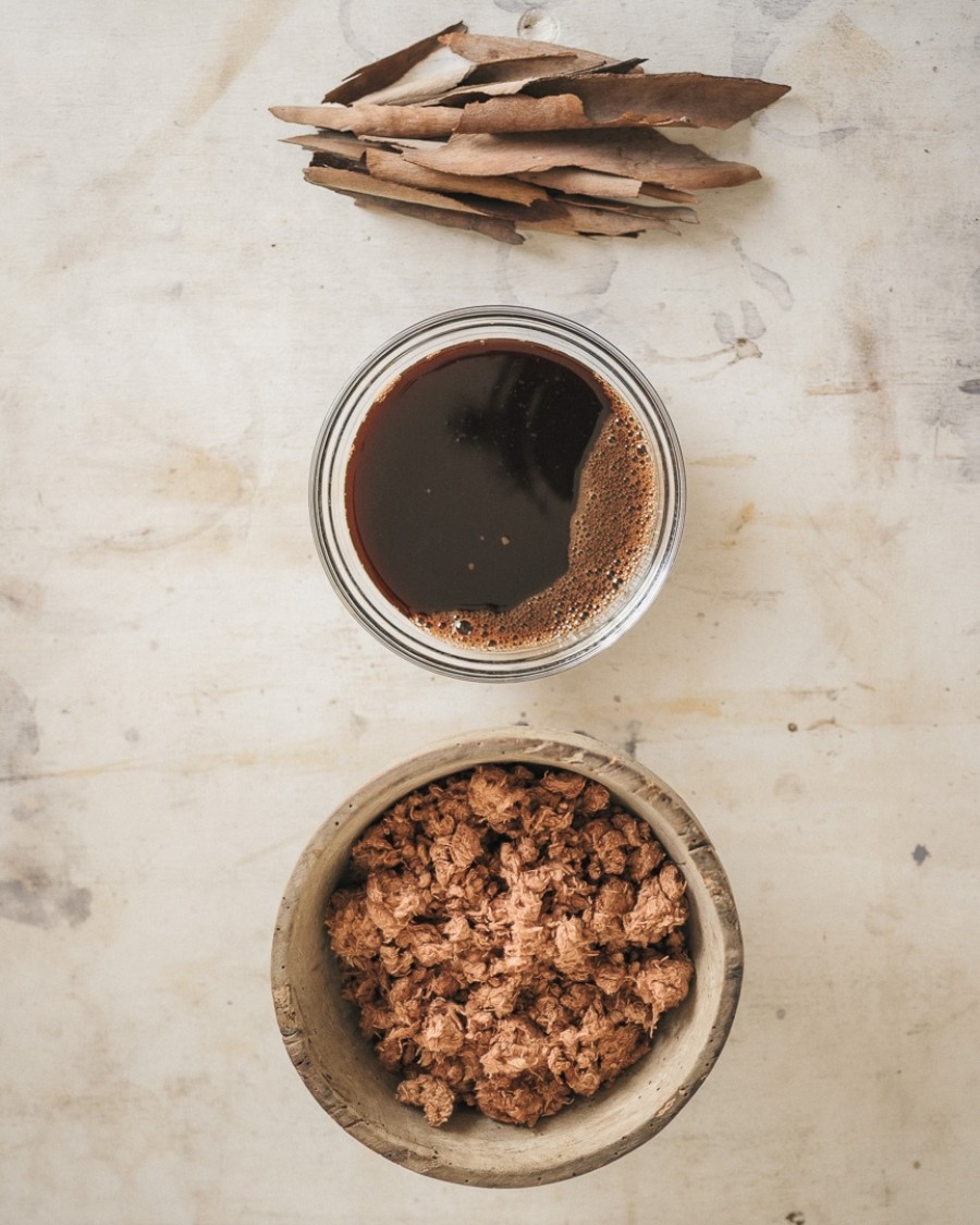 Recolección y extracción de color: El proceso comienza mucho antes de llegar al taller. Consiste en una búsqueda consciente de materias primas que el mundo considera basura. Recojo manualmente elementos botánicos y residuos alimenticios que, tras ser clasificados y limpiados, se someten a una cocción lenta para liberar sus pigmentos. El filtrado posterior es vital; es ahí donde obtengo tonos únicos, orgánicos y puros, imposibles de replicar mediante procesos industriales.