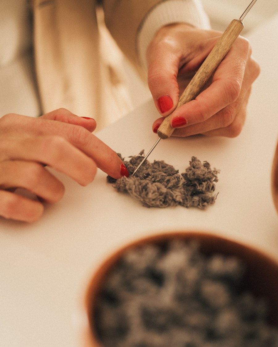 En lugar de recurrir a óleos o acrílicos, mi pincelada es la propia fibra. Extraigo la esencia cromática de la naturaleza utilizando pieles de cebolla, cáscaras de granada o cortezas de eucalipto, entre otros. Mi proceso creativo es un camino técnico y artesanal, un ritual de “fuego lento” que se divide en tres fases fundamentales: