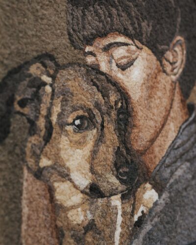 Construcción y volumen: Sobre el soporte de madera, la obra cobra tridimensionalidad. Utilizando un adhesivo natural de metilcelulosa de elaboración propia, voy superponiendo los fragmentos de tela. Esta técnica de capas me permite construir volúmenes y profundidades a través de la propia materia. Es, en esencia, pintar sin pintura, traduciendo mi propósito en un lenguaje visual coherente.