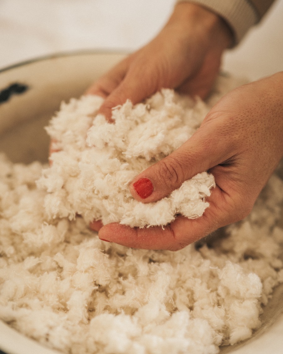 Tratamiento y teñido textil: Trabajo con residuos textiles —fibras naturales que han perdido su valor comercial— que son generosamente donados por la empresa Recykyo. Estas telas se preparan para absorber los baños botánicos. Es un proceso vivo: cada fibra reacciona de forma distinta al tinte, generando una paleta de texturas y matices que aportan una vibración especial a la obra, inalcanzable para la pintura tradicional.