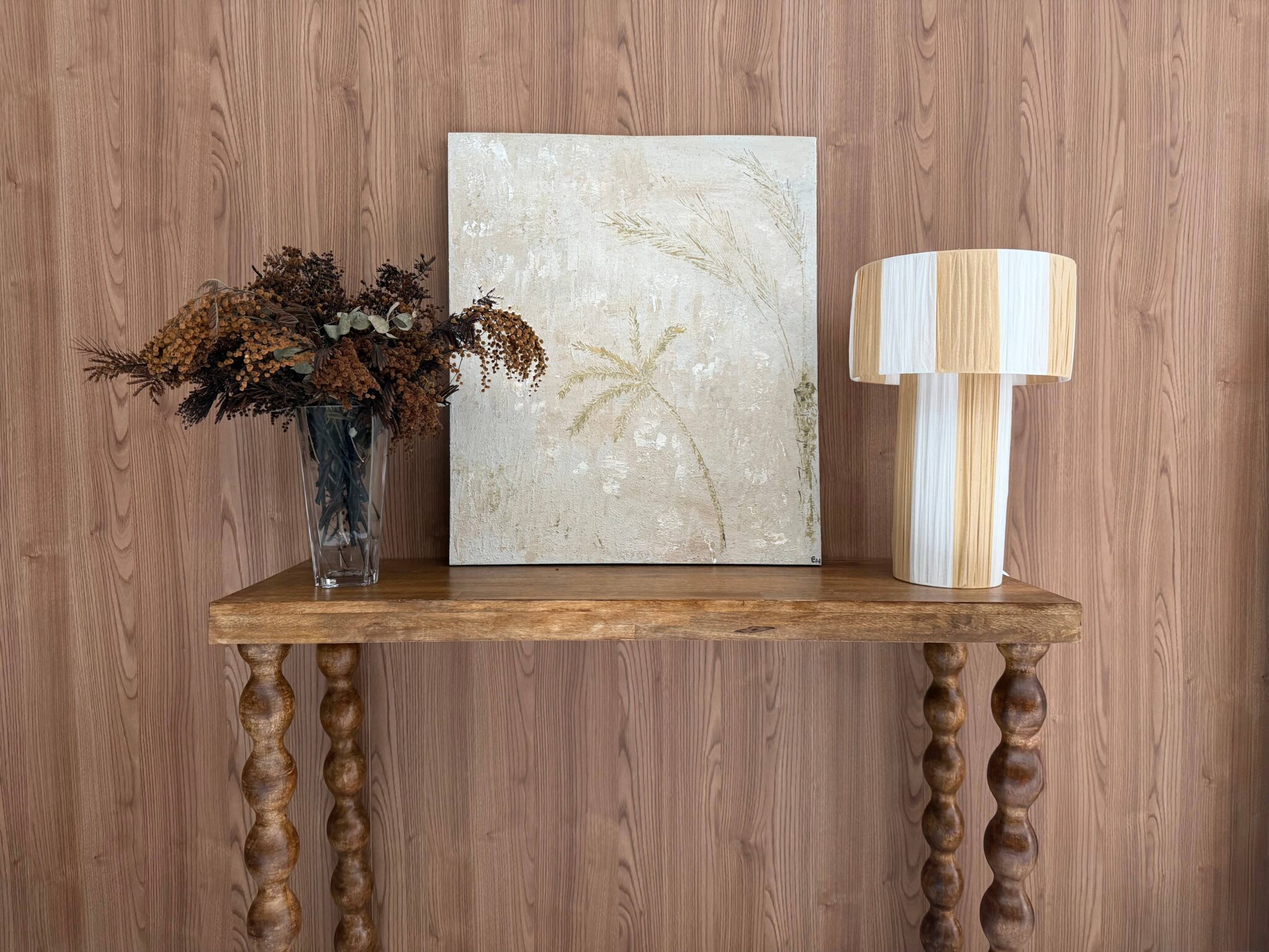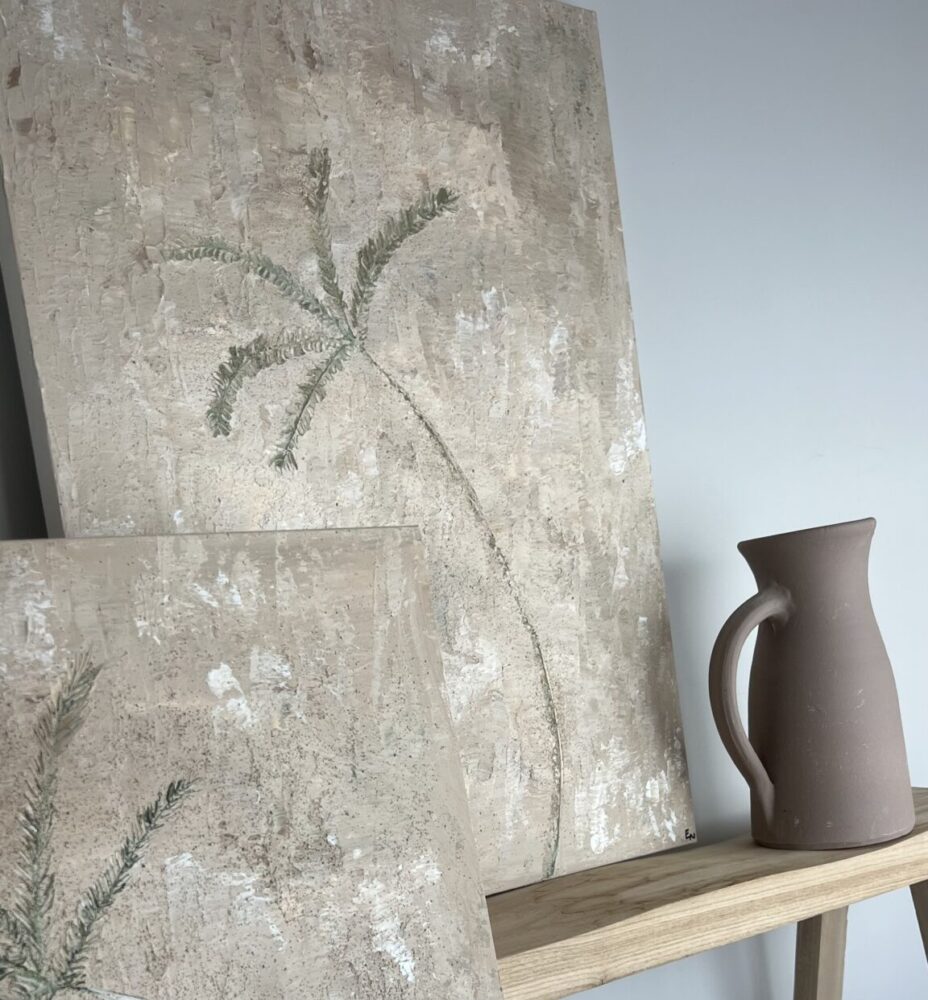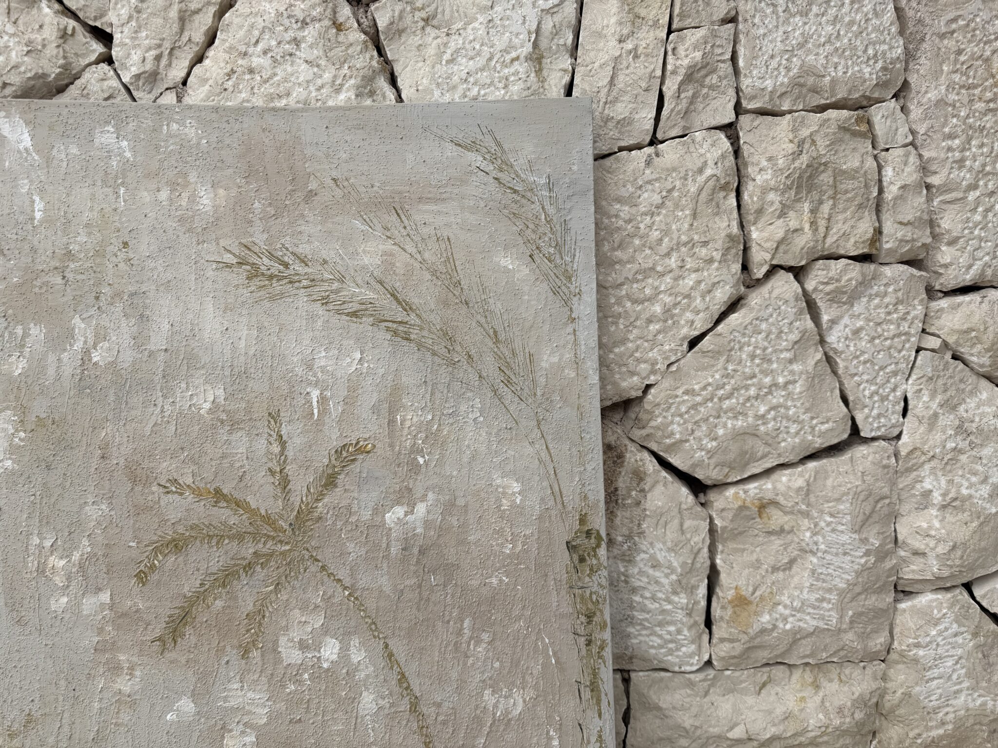 Inspirada por su origen mediterráneo y por el paisaje sereno que hoy la rodea (un mar de olivos en tierras jienenses), Esther Navarro presenta su última colección, Bambú. Se trata de una serie donde palmeras, cocoteros y formas minimalistas y abstractas construyen un universo tropical reinterpretado desde la calma y la sutileza. La delicadeza de cada pincelada convierten cada pieza en un elemento capaz de transformar el espacio.